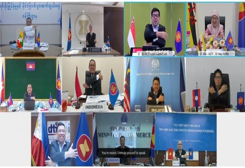 (၃၉) ကြိမ်မြောက် အာဆီယံ စီးပွားရေးပေါင်းစည်းမှုဆိုင်ရာ အဆင့်မြင့်လုပ်ငန်းအဖွဲ့ အစည်းအဝေး (39th Meeting of the High-level Task Force on ASEAN Economic Integration - HLTF-EI ) ကို ယနေ့တွင် ဗီဒီယိုကွန်ဖရင့်စနစ်ဖြင့် ကျင်းပရာ ရင်းနှီးမြှုပ် နှံမှုနှင့် နိုင်ငံခြားစီးပွားဆက်သွယ်ရေးဝန်ကြီးဌာန ဒုတိယဝန်ကြီး ဦးသန်းအောင်ကျော် တက်ရောက် သည်။