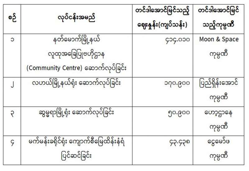 ပြန်ကြားရေးဝန်ကြီးဌာန၊ ပြန်ကြားရေးနှင့်ပြည်သူ့ဆက်ဆံရေးဦးစီးဌာန၊ ၂၀၂၀-၂၀၂၁ ဘဏ္ဍာရေးနှစ် အတွင်း အောက်ဖော်ပြပါ လူထုအခြေပြုဗဟိုဌာန (Community Centre) နှင့် ရုံးအဆောက်အအုံများ ဆောက်လုပ်ခြင်း၊ မြေထိန်းနံရံ ပြင်ဆင်ခြင်းတို့အတွက် ပြည်ထောင်စုအစိုးရအဖွဲ့ရုံး၏ ညွှန်ကြားချက်နှင့် အညီ သက်ဆိုင်ရာ တိုင်းဒေသကြီး/ ပြည်နယ်အစိုးရအဖွဲ့များ ကြီးကြပ်ကွပ်ကဲမှုဖြင့် တင်ဒါခေါ်ယူဆောင်ရွက်ခဲ့ရာ ယှဉ်တွဲပါကုမ္ပဏီများက အိတ်ဖွင့်တင်ဒါ အောင်မြင်ကြောင်း ကြေညာအပ်ပါသည်-