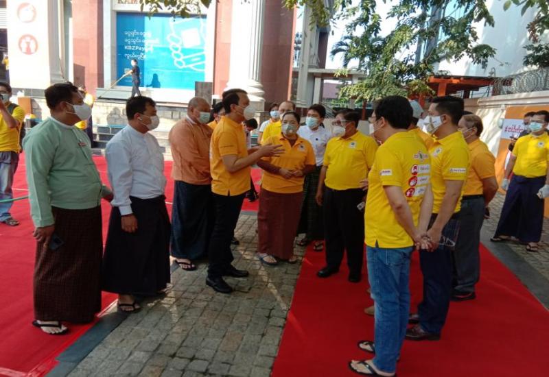 Stop Covid-19 အဝါရောင် အသိပညာပေး ပိုစတာဖွင့်ပွဲကို ယမန်နေ့မွန်လွဲ ၃ နာရီက ရန်ကုန်မြို့ ဆူးလေဘုရားလမ်းရှိ Tourist Burma အဆောက်အဦ ရှေ့၌ ကျင်းပသည်။