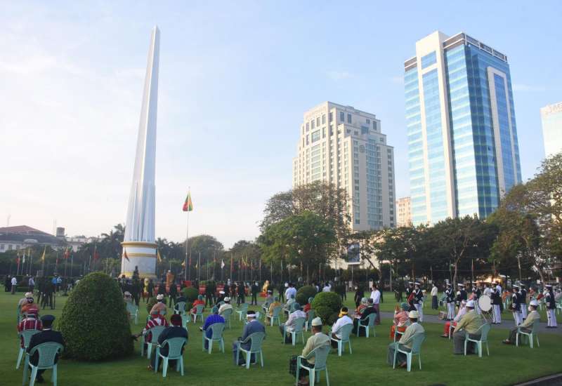 ၂၀၂၁ ခုနှစ် (၇၃) နှစ်မြောက် လွတ်လပ်ရေးနေ့ အလံတင်အခမ်းအနားနှင့် နိုင်ငံ တော်အလံ အလေးပြုခြင်း အခမ်းအနားကို ယနေ့ နံနက်ပိုင်းတွင် ရန်ကုန်မြို့ မဟာဗန္ဓုလ ပန်းခြံရှိ လွတ်လပ်ရေး ကျောက်တိုင်ရှေ့၌ ကိုဗစ်-၁၉ ကာကွယ်၊ ထိန်းချုပ်၊ကုသရေး၊ အမျိုး သားအဆင့် ဗဟိုကော်မတီနှင့် ကျန်းမာရေးနှင့် အားကစား ဝန်ကြီးဌာနတို့က ထုတ်ပြန်ထား သည့်ညွှန်ကြားချက်များနှင့်အညီ ကျင်းပသည်။