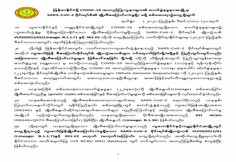 ၁။ ယူကေနိုင်ငံနှင့် ကမ္ဘာ့နိုင်ငံအချို့တွင် COVID-19 စစ်ဆေးတွေ့ရှိသော ဓာတ်ခွဲနမူနာများ၌ ကူးစက်ပျံ့နှံ့မှု ပိုမိုများပြားနိုင်သော မျိုးဗီဇပြောင်းလဲမှုရှိသည့် SARS-CoV-2 ဗိုင်းရပ်စ် မျိုးကွဲသစ် VUI202012/01(Lineage: B.1.1.7) နှင့် 501.V2 တို့ကို တွေ့ရှိရကြောင်း သက်ဆိုင်ရာနိုင်ငံများမှ (၂၀၂၀) ပြည့်နှစ်၊ ဒီဇင်ဘာလအတွင်း ထုတ်ပြန်ကြေညာခဲ့ကြပါသည်။