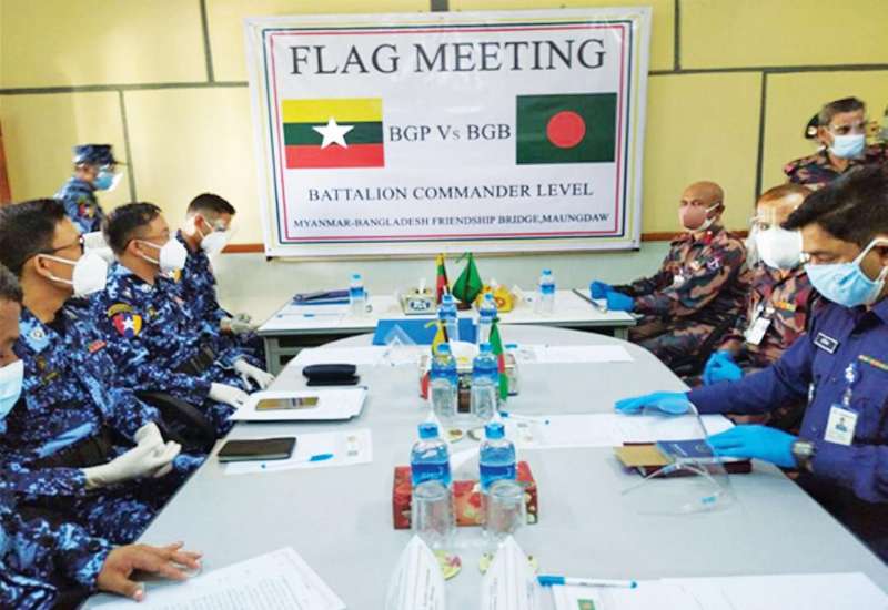 မြန်မာ-ဘင်္ဂလားဒေ့ရှ် နှစ်နိုင်ငံ နယ်ခြားစောင့်တပ်ဖွဲ့များ၏ တပ်ရင်းမှူးအဆင့် အလံတင်အစည်းအဝေးကို ရခိုင် ပြည်နယ် မောင်တောမြို့ အမှတ်(၁) လူဝင်/ထွက် စစ်ဆေး ရေးစခန်း (POE)၌ ယနေ့ နံနက် ၁၁ နာရီခွဲတွင် ကျင်းပ သည်။