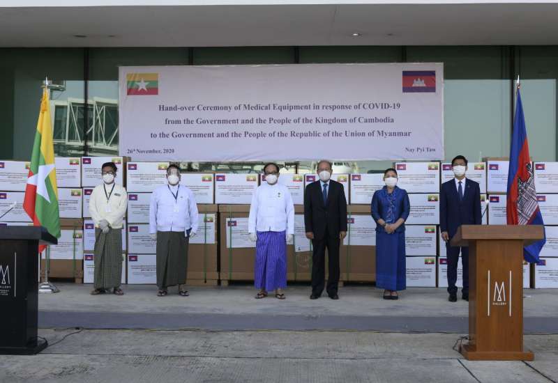 ကမ္ဘောဒီးယားနိုင်ငံ အစိုးရနှင့် ပြည်သူများက မြန်မာနိုင်ငံ အစိုးရနှင့် ပြည်သူများ ကိုဗစ်-၁၉ ကာကွယ်၊ ထိန်းချုပ်၊ ကုသရေး လုပ်ငန်းများတွင် အသုံးပြုနိုင်ရန်အတွက် အထောက်အကူပြုပစ္စည်းများ လှူဒါန်းမှုကို ယနေ့ နံနက်ပိုင်းတွင် နေပြည်တော် အပြည်ပြည်ဆိုင်ရာ လေဆိပ်၌ ပြုလုပ်ရာ Coronavirus Disease 2019 (COVID-19) ကာကွယ်၊ ထိန်းချုပ်၊ ကုသရေး အမျိုးသားအဆင့် ဗဟိုကော်မတီ အတွင်းရေးမှူး (၂)၊ ကျန်းမာရေးနှင့်အားကစားဝန်ကြီးဌာန၊ ပြည်ထောင်စုဝန်ကြီး ဒေါက်တာ မြင့်ထွေးက လက်ခံခဲ့သည်။