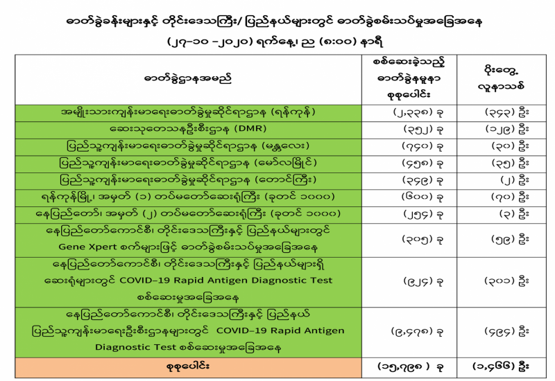 (၂၆-၁၀-၂၀၂၀) ရက်နေ့၊ ည (၈:၀၀) နာရီမှ (၂၇-၁၀-၂၀၂၀) ရက်နေ့၊ ည (၈:၀၀) နာရီ အတွင်း ဓာတ်ခွဲနမူနာ စုစုပေါင်း (၁၅,၇၉၈) ခုအား စစ်ဆေးပြီးစီးခဲ့ရာ COVID-19 ရောဂါ ဓာတ်ခွဲ အတည်ပြု လူနာသစ် (၁,၄၆၆)ဦး တွေ့ရှိရပါသည်။