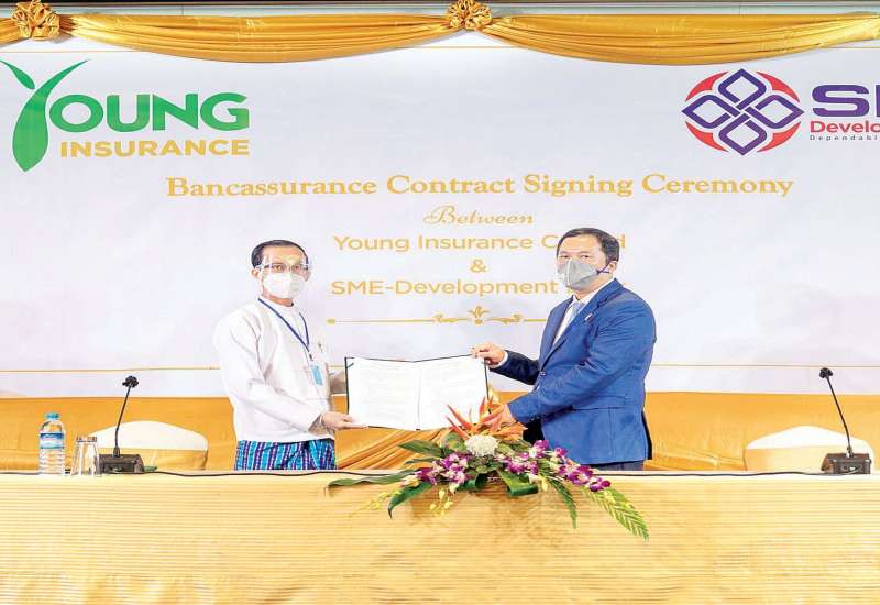 Young Insurance Co.,Ltd နှင့် SME-Development Bank တို့၏ ဘဏ်နှင့် အာမခံလုပ်ငန်း ပူးပေါင်းဆောင်ရွက်မှုဖြစ်သော Bancassurance စတင်ဆောင်ရွက်ခြင်း လက်မှတ်ရေးထိုးပွဲ အခမ်းအနားကို အောက်တိုဘာ ၂၀ ရက် နံနက် ၁၀ နာရီက ရန်ကုန်မြို့ ချက်ထရီယံဟိုတယ်၌ ကျင်းပရာ Young Insurance Company မှ အကြီးတန်း အထွေထွေမန်နေဂျာ ဦးအောင်စိုးဦးနှင့် SME Development Bank CEO ဒေါက်တာဇေယျာညွန့် တို့က နှစ်ဖက်သဘောတူစာချုပ်ကို လက်မှတ်ရေးထိုးလဲလှယ်လိုက်ကြကြောင်း သိရသည်။