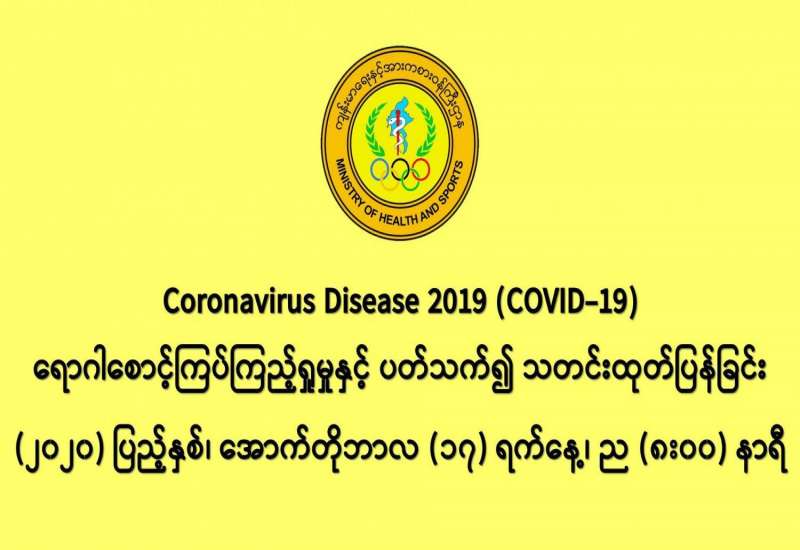 (၁၆-၁၀-၂၀၂၀) ရက်နေ့၊ ည (၈:၀၀)နာရီမှ (၁၇-၁၀-၂၀၂၀) ရက်နေ့၊ ည (၈:၀၀) နာရီ အတွင်း ဓာတ်ခွဲနမူနာ စုစုပေါင်း (၁၉,၇၃၆) ခုအား စစ်ဆေးပြီးစီးခဲ့ရာ COVID-19 ရောဂါ ဓာတ်ခွဲအတည်ပြု လူနာသစ် (၁,၃၈၇)ဦး တွေ့ရှိရပါသည်။