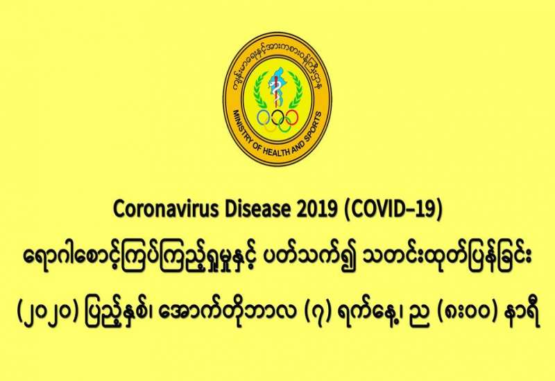 (၇-၁၀-၂၀၂၀) ရက်နေ့၊ ည (၈:၀၀)နာရီမှ (၈-၁၀-၂၀၂၀) ရက်နေ့၊ ည (၈:၀၀) နာရီ အတွင်းဓာတ်ခွဲနမူနာ စုစုပေါင်း (၁၂,၂၆၈)ခုအား စစ်ဆေးပြီးစီးခဲ့ရာ COVID-19 ရောဂါ ဓာတ်ခွဲ အတည်ပြု လူနာသစ် (၁,၀၁၂)ဦး တွေ့ရှိရပါသည်။