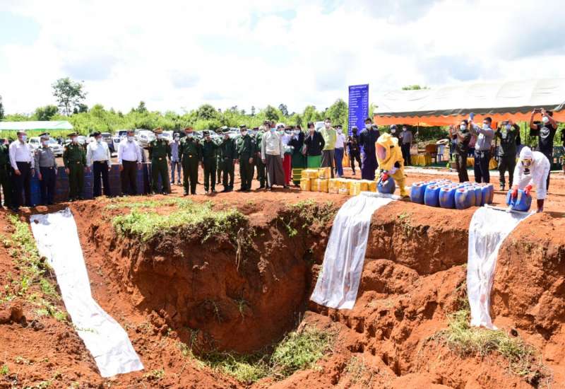 ရှမ်းပြည်နယ်(တောင်ပိုင်း)၊ လွိုင်လင်ခရိုင်၊ ခိုလမ်နယ်မြေရဲစခန်းမှ ဖမ်းဆီးရမိသော မူးယစ်ဆေးဝါးချက်လုပ်ရာတွင် အသုံးပြုမည့် အက်စစ်ပုံးများ ဖျက်ဆီးခြင်းကို ယနေ့ နံနက်(၁၁) နာရီက ခိုလမ်-ကျိုင်းတောင်းကားလမ်းမဘေးတွင် ကျင်းပသည်။