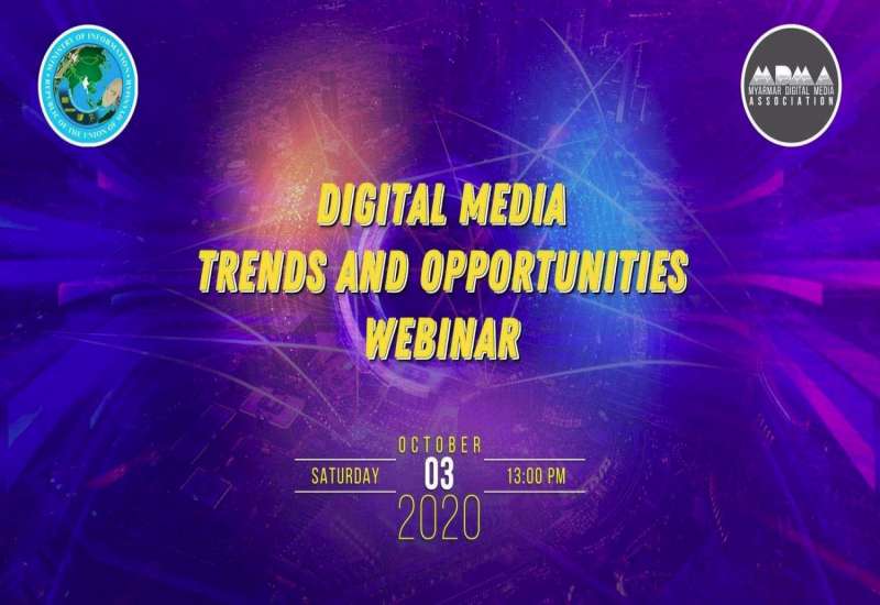 မြန်မာနိုင်ငံ ဒီဂျစ်တယ် မီဒီယာအသင်းဖြစ်မြောက်ရေး ကော်မတီက စီစဉ်ကျင်းပသည့် Digital Media Trends and Opportunities Webinar ကို ၂၀၂၀ ပြည့်နှစ် အောက်တိုဘာ ၃ ရက် မွန်းလွဲ (၁) နာရီအချိန်တွင် ကျင်းပပြုလုပ်မည်ဖြစ်ပြီး Digital Media Guide to Work-From-Home ခေါင်းစဉ်နှင့် Digital Media Monetisation Opportunities & Challenges ခေါင်းစဉ် များဖြင့် ဆွေးနွေးမည် ဖြစ်ပါသည်။
