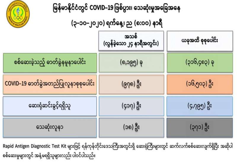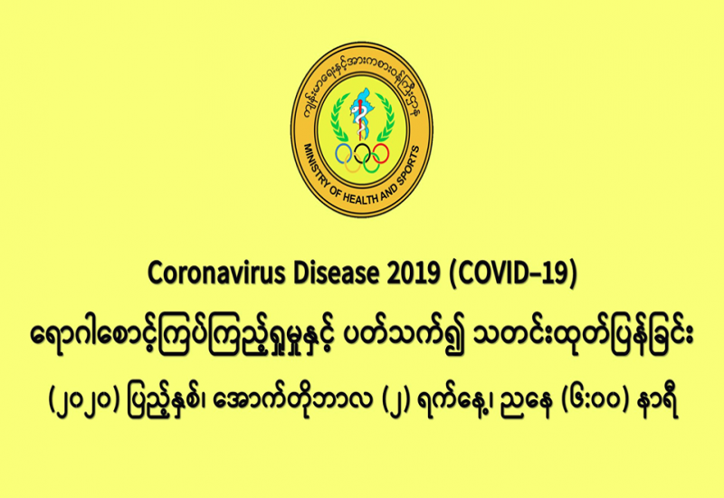 (၂-၁၀-၂၀၂၀) ရက်နေ့၊ ည (၈:၀၀)နာရီမှ (၃-၁၀-၂၀၂၀) ရက်နေ့၊ ည (၈:၀၀)နာရီ အတွင်း ဓာတ်ခွဲနမူနာ စုစုပေါင်း (၈,၁၉၅) ခုအား စစ်ဆေးပြီးစီးခဲ့ရာ COVID-19 ရောဂါ ဓာတ်ခွဲအတည်ပြု လူနာသစ် (၉၇၈)ဦး တွေ့ရှိရပါသည်။