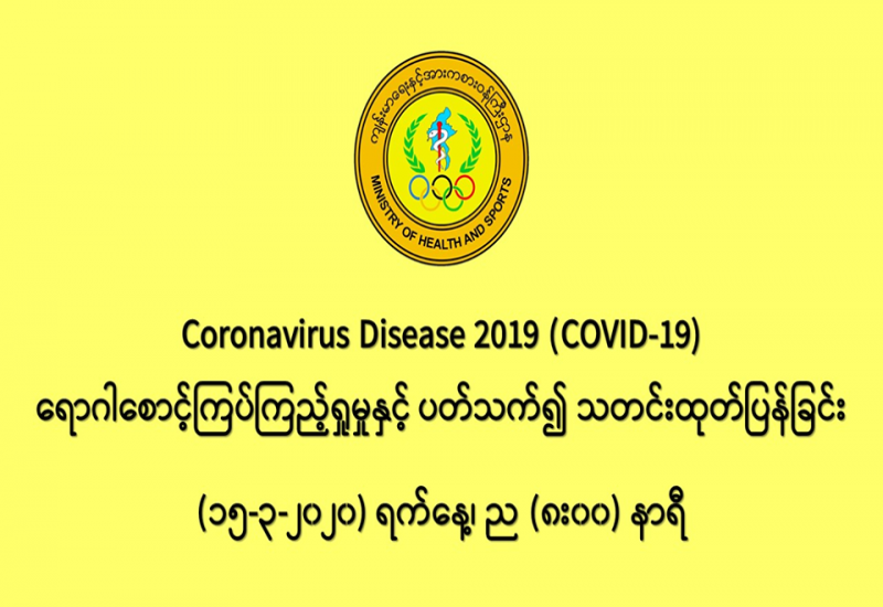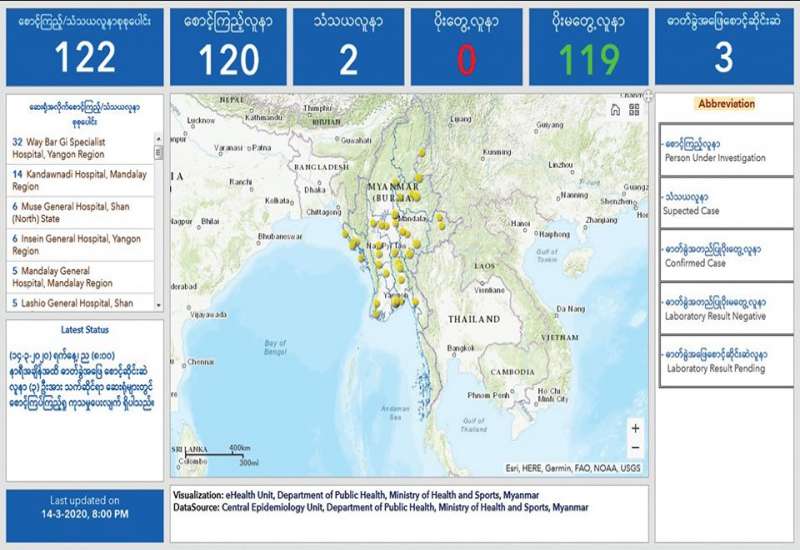 ကိုရိုနာဗိုင်းရပ်စ်(COVID-19)နှင့် ပတ်သက် သည့် သတင်းမှန်များကို အချိန်နှင့်တစ်ပြေးညီ update ပြုလုပ်၍ တင်ပေးနေသည့် Surveil-lance Dashboard ဝက်ဘ်စာမျက်နှာကို ကျန်းမာရေးဝန်ကြီးဌာနက လွှင့်တင်ထားပြီး ကျန်းမာရေးဝန်ကြီးဌာနဝက်ဘ်ဆိုက် http:// mohs.gov.mm မှတစ်ဆင့် Coronavirus Desease 2019 ခေါင်းစဉ်သို့ ဝင်ရောက်၍ဖြစ်စေ၊ http://mohs.gov.mm/Main/content/publication/2019-ncov ဝက်ဘ်ဆိုက်လိပ်စာသို့ တိုက်ရိုက် ဝင်ရောက်၍ဖြစ်စေ ကြည့်ရှုနိုင်ပြီ ဖြစ်သည်။