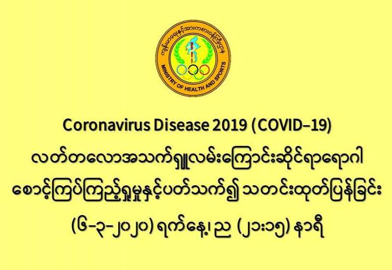 ၁။ ကျန်းမာရေးနှင့်အားကစားဝန်ကြီးဌာနသည် COVID-19 ရောဂါကာကွယ်ထိန်းချုပ်ရေးလုပ်ငန်းများကို အရှိန်အဟုန်ဖြင့် ဆက်လက်ဆောင်ရွက်လျက်ရှိပြီး သံသယလူနာ၊ စောင့်ကြည့်လူနာနှင့် COVID-19 ရောဂါဖြစ်ပွားသူနှင့် ထိတွေ့ခဲ့သူများထံမှ ဓာတ်ခွဲနမူနာများရယူ၍ အမျိုးသားကျန်းမာရေးဓာတ်ခွဲမှုဆိုင်ရာဌာန (ရန်ကုန်) တွင် စစ်ဆေးလျက်ရှိပါသည်။