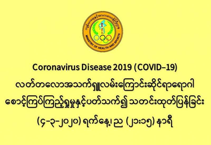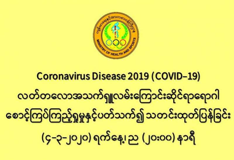 ၁။ ကျန်းမာရေးနှင့်အားကစားဝန်ကြီးဌာနသည် တရုတ်ပြည်သူ့သမ္မတနိုင်ငံနှင့် ကမ္ဘာ့နိုင်ငံ (၇၂) နိုင်ငံတွင် ကူးစက်ပျံ့နှံ့လျက်ရှိသည့် COVID-19 လတ်တလောအသက်ရှူလမ်းကြောင်းဆိုင်ရာ ရောဂါဖြစ်ပွားမှု ဖြစ်စဉ် နှင့်ပတ်သက်၍ ရောဂါစောင့်ကြပ်ကြည့်ရှုခြင်း လုပ်ငန်းများအား အပြည်ပြည်ဆိုင်ရာ ဝင်ပေါက်၊ ထွက်ပေါက် ဂိတ်များတွင်လည်းကောင်း၊ ဆေးရုံအခြေပြုအဖြစ်လည်းကောင်း၊ ပြည်သူလူထုအခြေပြု စောင့်ကြပ်ကြည့်ရှု ခြင်းလုပ်ငန်းများဖြင့်လည်းကောင်း၊ ပုဂ္ဂလိကဆေးရုံများ နှင့် ပူးပေါင်း၍လည်းကောင်း ဆောင်ရွက်လျက် ရှိပါသည်။