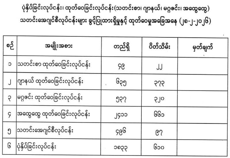 ပုံနှိပ်ခြင်းလုပ်ငန်း၊ ထုတ်ဝေခြင်းလုပ်ငန်း(သတင်းစာ၊ ဂျာနယ်၊ မဂ္ဂဇင်း၊ အထွေထွေ) သတင်းအေဂျင်စီလုပ်ငန်းများ ခွင့်ပြုထားရှိမှုနှင့် ထုတ်ဝေမှုအခြေအနေ (၂၈-၂-၂၀၂၆)