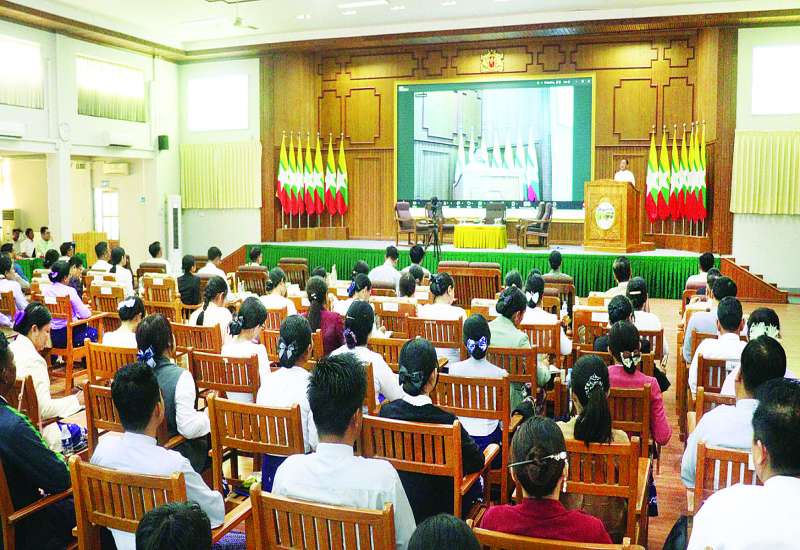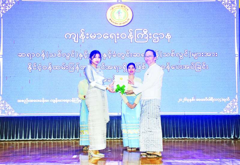 ကျန်းမာရေးဝန်ကြီးဌာန ဆရာဝန် (သစ်လွင်) နှင့် သွားနှင့်ခံတွင်းဆရာဝန် (သစ်လွင်) များအား နိုင်ငံ့ဝန်ထမ်းပြန်တမ်းဝင်အရာရှိအဖြစ် တာဝန်ပေးအပ်ခြင်းအခမ်းအနားကို ယနေ့နံနက် ၉ နာရီတွင် ကျန်းမာရေးဝန်ကြီးဌာန အစည်းအဝေးခန်းမ၌ ကျင်းပသည်။