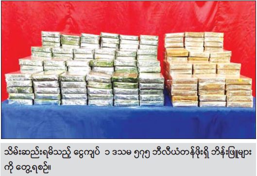 မူးယစ်ဆေးဝါးတားဆီးနှိမ်နင်းရေးရဲတပ်ဖွဲ့မှ တပ်ဖွဲ့ဝင်များပါဝင်သော ပူးပေါင်းအဖွဲ့သည် ဒီဇင်ဘာ ၃၁ ရက်နံနက် ၉ နာရီခွဲတွင် တာချီလိတ်မြို့နယ်၊ ဖန်မင်အုပ်စု၊ ပါဝုန်းကျေးရွာအနီးရှိ လမ်းဘေးလယ်ကွင်းစပ်ရှိ ကောက်ရိုးပုံအောက်တွင် မသင်္ကာဖွယ် အထုပ်များတွေ့ရှိကြောင်း သတင်းအရ သွားရောက်စစ်ဆေးရှာဖွေရာ ငွေကျပ် ၁ ဒသမ ၅၇၅ ဘီလီယံတန်ဖိုးရှိ ဘိန်းဖြူ ၁၀၅ ကီလိုကို လည်းကောင်း။