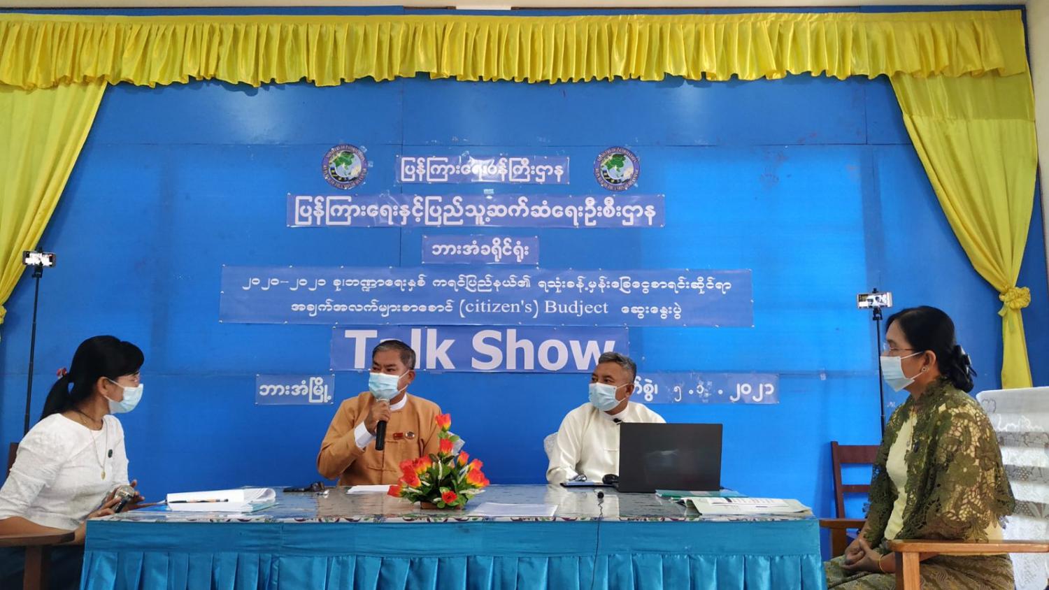 Talk Show  ဆွေးနွေးပွဲတွင်  ကရင်ပြည်နယ်အစိုးရအဖွဲ့၊ စီမံကိန်း၊ဘဏ္ဍာရေးနှင့်စည်ပင်သာယာရေးဝန်ကြီး ဦးသန်းနိုင်၊ ပြည်နယ်ရသုံးမှန်းခြေငွေစာရင်းဦးစီးဌာန ညွှန်ကြားရေးမှူးဦးသန်းရီ၊ ပြည်နယ်စီမံကိန်းရေးဆွဲရေးဦးစီးဌာန ပြည်နယ်ဦးစီးမှူး ဒေါ်ခင်သန်းနု တို့က ဘဏ္ဍာရေးဆိုင်ရာပွင့်လင်းမြင်သာမှုရှိရေး၊ တာဝန်ယူမှု တာဝန်ခံမှုရှိရေး၊ ပြည်သူလူထုပူးပေါင်း ပါဝင်နိုင်မည့်နည်းလမ်းများ ဖော်ထုတ်ပေးရေး၊ Citizen Budget စာစောင်ကို ဖတ်ရှု့ခြင်းအားဖြင့် သိရှိနိုင်မည့်အချက်များ၊ ကရင်ပြည်နယ်အစိုးရအဖွဲ့၏လုပ်ငန်းတာဝန်များ၊ အစိုးရ၏ဦးစားပေးမူဝါဒများ၊ မေခရိုစီးပွားရေး ဆိုင်ရာအချက်အလက်များ၊ ဘတ်ဂျက်တွင်ပါဝင်သောဌာနအဖွဲ့အစည်းများ၊ နိုင်ငံတော်၏ဘဏ္ဍာရေးမူဝါဒ၊ ဘတ်ဂျက် လုပ်ငန်းစဉ်နှင့်ရေးဆွဲမှုတွင် ပါဝင်နိုင်သောအခွင့်အလမ်းများ၊ ဌာနအဖွဲ့အစည်းများ၏အရအသုံးအခြေအနေ၊ ဘဏ္ဍာရေး ဆိုင်ရာထောက်ပံ့မှု၊ ရငွေလျာထားမှု၊ အခွန်အကောက်လျာထားမှု၊ ပြည်သူရရှိနိုင်မည့်အကျိုးကျေးဇူးများ၊ ရန်ပုံငွေနှင့် ကြွေးမြီရငွေအခြေအနေတို့ကို ဆွေးနွေးခဲ့ကြသည်။