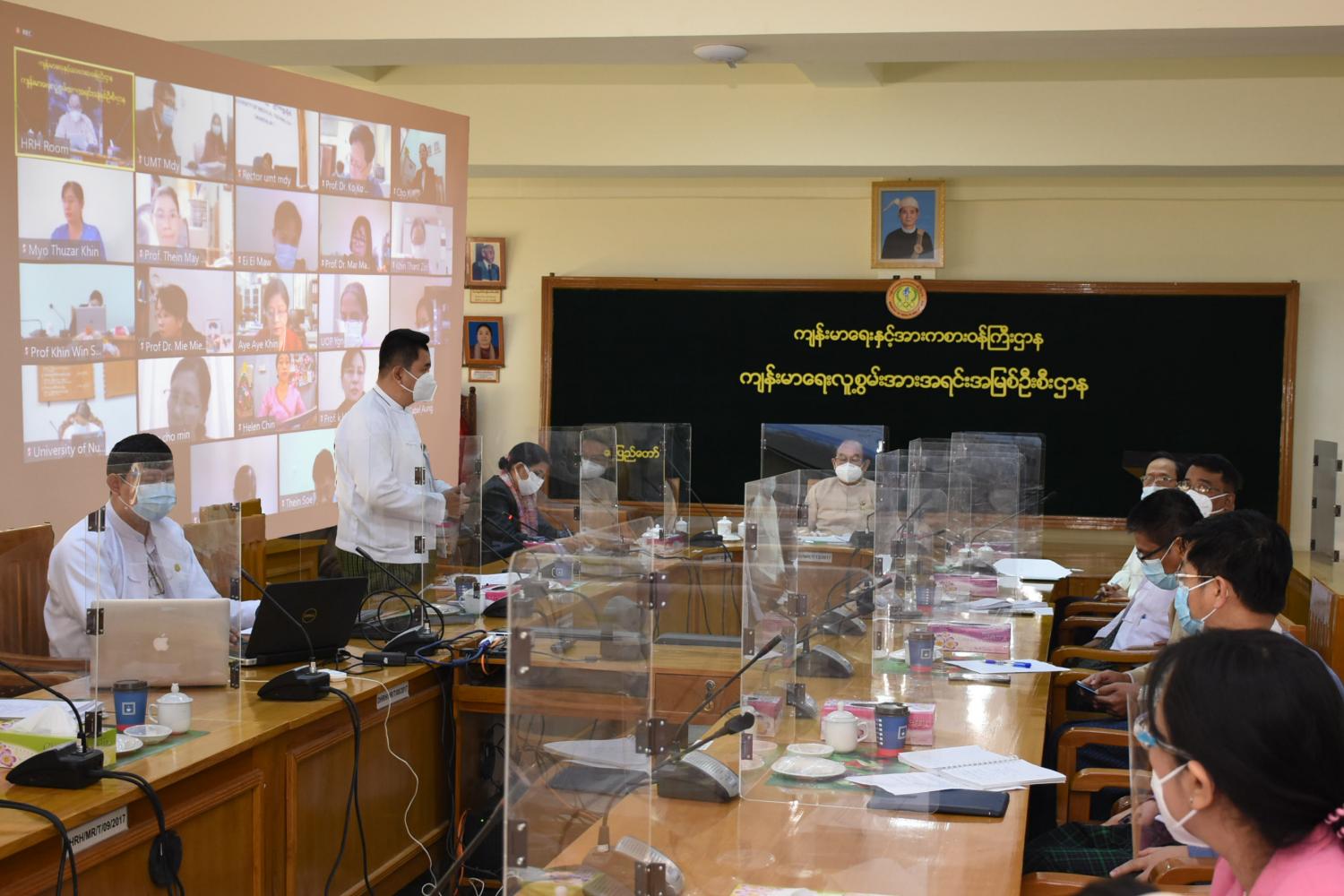 ဆေးပညာနှီးနွှယ် တက္ကသိုလ် (၇) ခု၏ နောက်ဆုံးနှစ် (၁/၂၀၂၀) (ပုံမှန်) သင်တန်းများ ပြန်လည်ဖွင့်လှစ်နိုင်ရေးနှင့် သင်ကြားရေးစနစ် ပိုမိုကောင်းမွန်စေရေး ညှိနှိုင်းအစည်းအဝေးကို ယနေ့နံနက်ပိုင်းတွင် ကျန်းမာရေးလူ့စွမ်းအားအရင်းအမြစ်ဦးစီးဌာန၌ ဗီဒီယိုကွန်ဖရင့်စနစ်ဖြင့် ကျင်းပသည်။