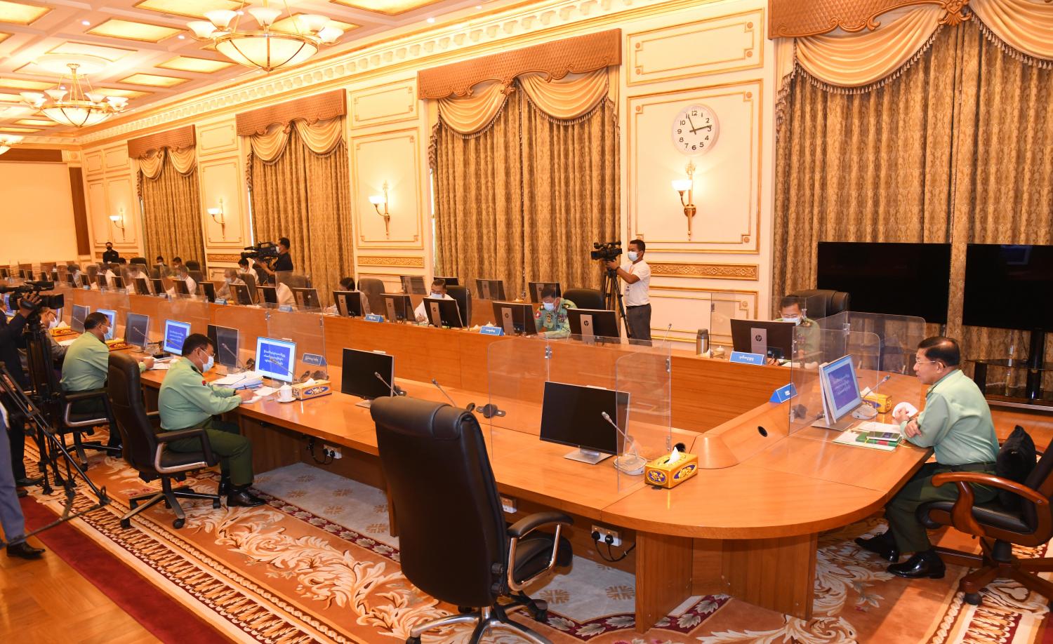 အစည်းအဝေးတွင် နိုင်ငံတော်စီမံအုပ်ချုပ်ရေးကောင်စီဥက္ကဋ္ဌ၊ တပ်မတော်ကာကွယ်ရေး ဦးစီးချုပ်က နိုင်ငံတော်စီမံအုပ်ချုပ်ရေး ကောင်စီအနေဖြင့် ယခုကာလတွင်ပုံမှန် အခြေအနေ ရောက်အောင် ဆောင်ရွက်နေခြင်းဖြစ်ကြောင်း၊ အရေးပေါ်ကာလ ကြေညာထားသည့် အချိန်အတွင်း လုပ်ငန်းများ ရပ်တန့်မနေဘဲ နိုင်ငံတော်အတွက် အကျိုးရှိသည့် လုပ်ငန်းများကို အရှိန်အဟုန်မပျက် ဆောင်ရွက်ရမည်ဖြစ်ကြောင်း၊ ထို့အတွက် ဝန်ကြီးဌာနများ၌ ပြည်ထောင်စု ဝန်ကြီးများ တာဝန်ပေးအပ် ရာတွင် အတွေ့အကြုံရှိသူများ၊ အရည်အချင်းရှိသူများ၊ လုပ်ငန်း များကို အောင်မြင်စွာ အကောင်အထည်ဖော် ဆောင်နိုင်မည့် ပုဂ္ဂိုလ်များအား တာဝန်ပေးအပ်ခဲ့ခြင်း ဖြစ်ကြောင်း၊ အစိုးရ၏တာဝန်မှာ ပြည်သူပြည်သားများ၏ အကျိုးကို ဖော်ဆောင်ပေးရန် ဖြစ်ကြောင်း၊ မိမိတို့သည် မူဝါဒချမှတ်ခြင်းနှင့် လုပ်ငန်းများလုပ်ဆောင်သည့် အဖွဲ့အစည်းဖြစ်ကြောင်း၊ ဝန်ကြီးဌာနများအနေဖြင့် ဌာနအလိုက်လုပ်ငန်းများကို မှန်မှန်ကန်ကန် မြန်မြန်ဆန်ဆန်ဆောင်ရွက်ရန် လိုအပ်ကြောင်း။
