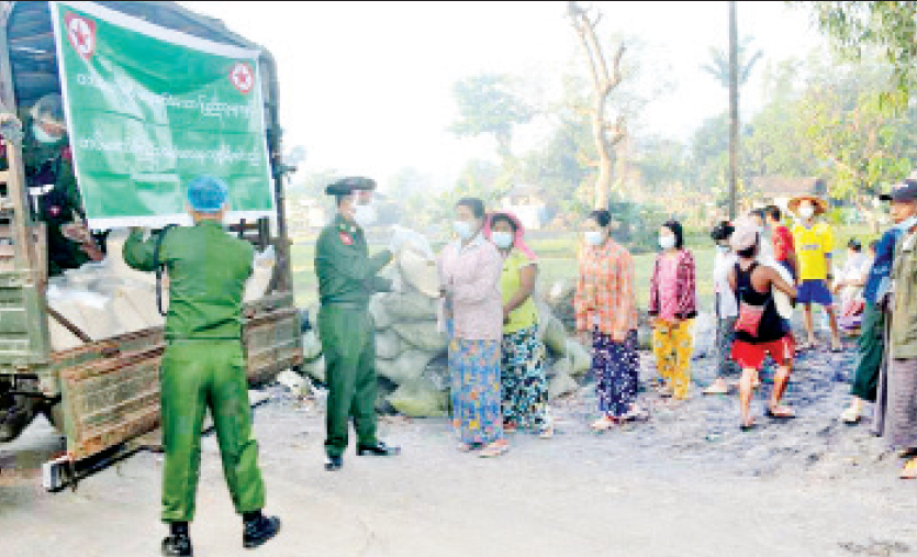 ကိုဗစ်-၁၉ ရောဂါ ကာကွယ်၊ ထိန်းချုပ်၊ ကုသမှုလုပ်ငန်းများဆောင်ရွက်နေစဉ်ကာလအတွင်း သွားလာမှုကန့်သတ်ချက်များကြောင့် ဒေသခံပြည်သူများ စားရေးအဆင်ပြေစေရန် အတွက် နယ်မြေခံ တပ်မတော် သားများက ဆန်၊ ဆီနှင့် စားသောက်ဖွယ်ရာများကို အိမ်အရောက် လိုက်လံပေးဝေ လှူဒါန်းလျက်ရှိသည်။