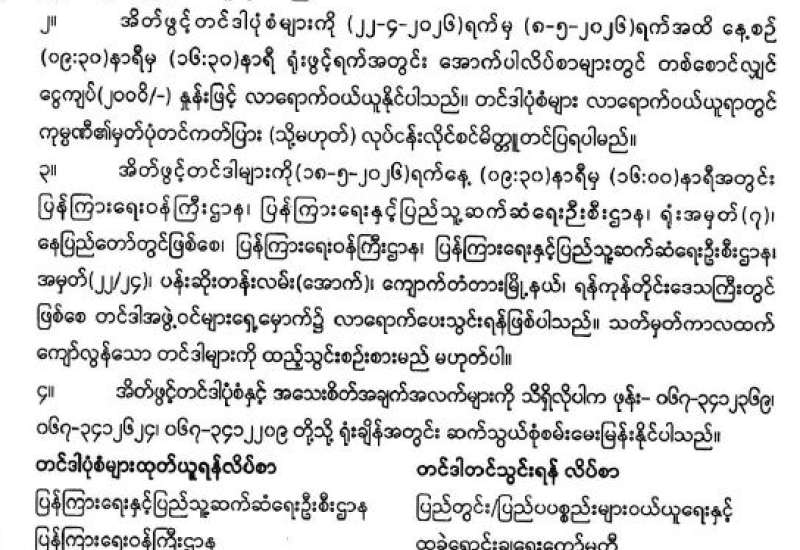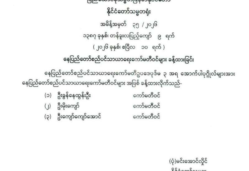နိုင်ငံတော်၏အကျိုးကို သယ်ပိုးဆောင်ရွက်ရန်အတွက် နိုင်ငံ့တာဝန်များကို မပျက်မကွက် ဆက်လက်ထမ်းဆောင်လျက်ရှိသည့် နိုင်ငံ့ဝန်ထမ်းများ လုပ်ငန်းခွင် မဝင်နိုင်အောင် နိုင်ငံတော်ကို ဆန့်ကျင်နှောင့်ယှက်မှုပြုနေသူအချို့က နည်းအမျိုးမျိုးဖြင့် ဖိအားပေးခြင်း ခြိမ်းခြောက်ခြင်းများ ပြုလုပ်နေကြောင်းကို ကြားသိ နေရပါသည်။ ဖိအားပေးခြိမ်းခြောက်သူများအနေဖြင့် ယင်းလုပ်ရပ်များသည် ဥပဒေနှင့် ဆန့်ကျင်သကဲ့သို့ မိမိ၏ အခွင့်အရေးနှင့် လွတ်လပ်ခွင့်များကို ကျင့်သုံးခြင်း ဆိုင်ရာ မူသဘောတရားများနှင့်လည်း ဆန့်ကျင်နေပါသည်။ ဝန်ထမ်းမဟုတ်သူ ပြည်သူလူထု အချင်းချင်းကြားတွင်လည်း အလားတူပြုလုပ်မှုများ ရှိနေကြောင်းကိုလည်း ကြားသိရပါသည်။ မည်သူမဆို မိမိ၏အခွင့်အရေးများနှင့် လွတ်လပ်ခွင့်များကို ကျင့်သုံးရာတွင် အခြားသူများ၏ အခွင့်အရေးနှင့် လွတ်လပ်ခွင့်များကို အသိအမှတ်ပြုရန်လိုအပ်ပါသည်။ ထို့အပြင် အများပြည်သူ အေးချမ်းသာယာရေးနှင့် အကျိုးစီးပွားဖြစ်ထွန်းရေးတို့ကို ဖြည့်ဆည်းရန် အတွက် ဥပဒေအရ သတ်မှတ်ထား သည့် ကန့်သတ်ချက်များအတိုင်း လိုက်နာကျင့်သုံးရန်လိုအပ်ပါသည်။ သို့ပါ၍ ဖိအားပေး ခြိမ်းခြောက်ခံရသူများ၏ အခွင့်အရေး ထိပါးနှောင့်ယှက်ခံရမှုများကို ဥပဒေကြောင်းအရ ကုစားပေး နိုင်ရေးနှင့် ထိပါးနှောင့်ယှက်သူများကို ဥပဒေအရ ထိရောက်စွာအရေးယူနိုင်ရေး အတွက် အောက်ပါ ဖုန်းနံပါတ်များနှင့် e-mail လိပ်စာများသို့ ဆက်သွယ်တိုင်ကြားနိုင်ပါကြောင်း အသိပေးအပ်ပါသည်။