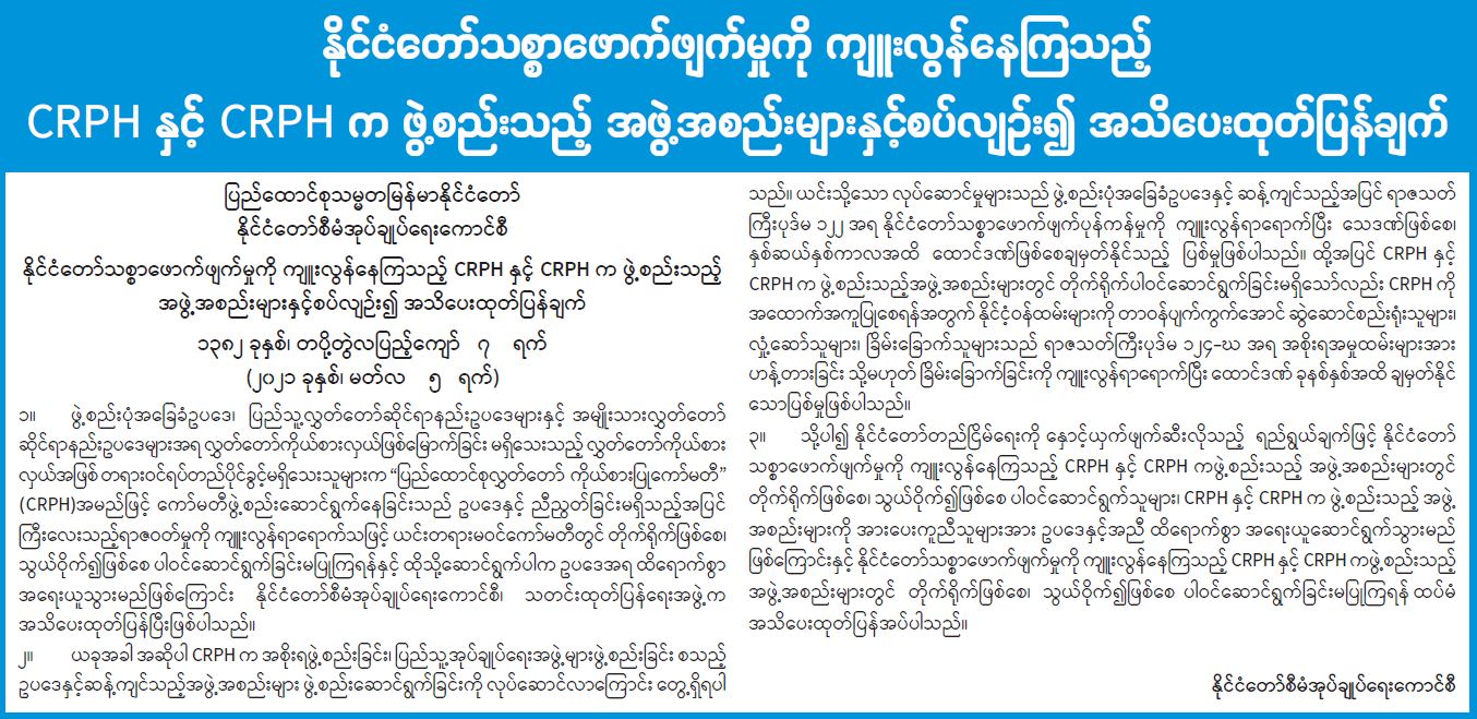 နိုင်ငံတော်သစ္စာဖောက်ဖျက်မှုကို ကျူးလွန်ကြသည် CRPH နှင့် CRPH က ဖွဲ့စည်းသည့် အဖွဲ့အစည်းများနှင့် စပ်းလျဉ်း၍ အသိပေးထုတ်ပြန်ချက် 03/06/2021