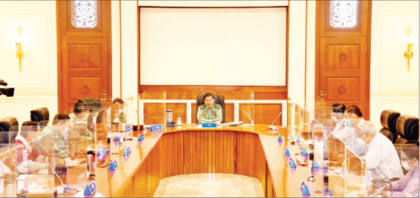 အရေးနှင့် မိုင်းရှင်းလင်းရေးလုပ်ငန်းများ ဆောင်ရွက် ပြီးစီးမှုအခြေအနေတို့ကို ရှင်းလင်းတင်ပြကြသည်။ “ တင်ပြချက်များနှင့်စပ်လျဉ်း၍ နိုင်ငံတော်စီမံ အုပ်ချုပ်ရေးကောင်စီဥက္ကဋက ဖွဲ့စည်းပုံအခြေခံ ဥပဒေနှင့်ဆန့်ကျင်နေသည့်ဥပဒေများကို ပယ်ဖက် နိုင်ရေး စိစစ်ဆောင်ရွက်လျက်ရှိကြောင်း CRP တွင်ပါဝင်နေသူများအား စိစစ်အရေးယူဆောင်ရွက် လျက်ရှိပြီး အချို့ ပုဂ္ဂိုလ်များက ၎င်းတို့အနေဖြင့် CRP တွင် ပါဝင်မှုမရှိသည်ကို ဆက်သွယ်ပြောဆိုလာမှုများရှိကြောင်း၊ အလားတူ အချို့ ဆရာဝန်များ ကလည်း ၎င်းတို့အနေဖြင့် COM တွင် ပါဝင်ဆောင် ရွက်မှုများမရှိသည်ကို ဆက်သွယ်ပြောကြားလာကြောင်း၊ ဝန်ကြီးဌာနများမှ နိုင်ငံ့ဝန်ထမ်းဥပဒေနှင့် ညီညွတ်မှုမရှိသည့် ကိစ္စရပ်များဆောင်ရွက်မှုတွင် ထွက်ပြေးတိမ်းရှောင်နေသူများကို ဖမ်းဆီးရမိရေး