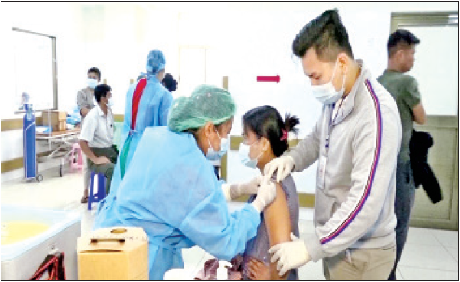 “ ထိုသို့ ဆောင်ရွက်ပေးလျက်ရှိရာ ယနေ့တွင် ရှမ်းပြည်နယ်(မြောက်ပိုင်း) လားရှိုးမြို့ အတွင်းရှိ ဌာနဆိုင်ရာဝန်ထမ်းများနှင့် ဒေသခံတိုင်းရင်းသား ပြည်သူများကို သတ်မှတ် နေရာအသီးသီး၌ လည်းကောင်း၊ ရှမ်းပြည်နယ်(တောင်ပိုင်း) တောင်ကြီးမြို့၊ အေးသာယာမြို့၊ ကလောမြို့၊ အောင်ပန်းမြို့၊ ဟိုပုံး မြို့၊ ပင်လောင်းမြို့နယ်၊ ပင်းတယမြို့နယ်၊ ရွာငံ မြို့နယ်၊ ဆီဆိုင်မြို့နယ်၊ မိုးဗြဲမြို့နယ်၊ ဖယ်ခုံမြို့နယ်၊ လင်းခေးမြို့၊ လွိုင်လင်မြို့၊ နမ့်စန်မြို့၊ မောက်မယ် မြို့နှင့် ကယားပြည်နယ် လွိုင်ကော်မြို့၊ ဘောလခဲ မြို့နယ်များအတွင်းရှိ ထေရ်ကြီးဝါကြီး ဆရာတော် ကြီးများ၊ ဌာနဆိုင်ရာဝန်ထမ်းများနှင့် ဒေသခံ တိုင်းရင်းသားပြည်သူများကို သတ်မှတ်နေရာ အသီးသီး၌ လည်းကောင်း၊ ရန်ကုန်တိုင်းဒေသကြီး မရမ်းကုန်းမြို့နယ်ရှိ ထေရ်ကြီးဝါကြီး ဆရာတော်ကြီး များအား သီရိမင်္ဂလာ ကမ္ဘာအေးကုန်းမြေရှိ နိုင်ငံတော် သံဃမဟာနာယကအဖွဲ့ရုံး ဘုရားကျောင်းဆောင်၌ လည်းကောင်း၊ ဧရာဝတီတိုင်းဒေသ ကြီး ကန်ကြီးထောင့်မြို့၊ ကျုံပျော်မြို့၊ ရေကြည်မြို့နှင့် ငပုတောမြို့များအတွင်းရှိ သံဃာတော်များ၊ ဌာန ဆိုင်ရာ ဝန်ထမ်းများနှင့် ဒေသခံပြည်သူများကို သတ်မှတ်နေရာအသီးသီး၌ လည်းကောင်း၊ ရခိုင် ပြည်နယ် စစ်တွေမြို့ရှိ ထေရ်ကြီးဝါကြီး ဆရာတော် ကြီးအား သတ်မှတ်နေရာ၌ လည်းကောင်း၊ မန္တလေး တိုင်းဒေသကြီး မန္တလေးမြို့တော်စည်ပင်သာယာ ရေးကော်မတီမှ ဌာနဆိုင်ရာဝန်ထမ်းများကို သတ်မှတ်နေရာအသီးသီး၌ လည်းကောင်း သက်ဆိုင်ရာ တိုင်းစစ်ဌာန ချုပ်များမှတပ်မတော်သား ( ပါရဂူများ၊ ဆရာဝန်များနှင့် သူနာပြုများပါဝင်သော ဆေးအဖွဲ့များက CDM တွင် ပါဝင်ခြင်းမရှိဘဲ ပြည်သူ လူထု၏ ကျန်းမာရေးစောင့်ရှောက်မှု လုပ်ငန်းများ ကို ဆောင်ရွက်ပေးနေသည့် ပြည်သူ့ဆေးရုံများမှ ဆရာဝန်များ၊ ကျန်းမာရေး ဝန်ထမ်းများနှင့်အတူ ပူးပေါင်း၍ ကျန်းမာရေးစစ်ဆေးပေးပြီး ကိုဗစ်-၁၉ရောဂါ ကာကွယ် ဆေးထိုးနှံ ပေးခြင်းများ ဆောင်ရွက် ပေးကြသည်။