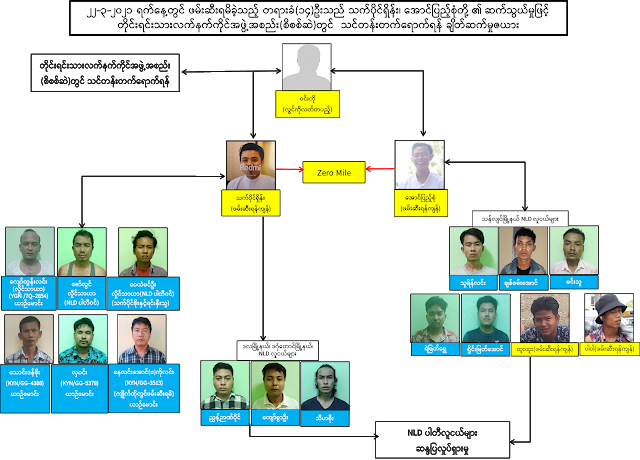 ထိန်းသိမ်းခံရသူများ၏ထွက်ဆိုချက်အရ ၎င်းတို့သည် NLD ပါတီဝင်များ ဖြစ်ပြီး ရန်ကုန်မြို့တွင်း ဆန္ဒပြပွဲများတွင် ပါဝင်လှုပ်ရှားခဲ့ကြောင်း၊ ထို့နောက် အဖွဲ့အတွင်းရှိ သက်ပိုင်ရှိန်းနှင့် အောင်ပြည့်စုံ ဆိုသူတို့၏ စည်းရုံး လှုံ့ဆော်မှုဖြင့် တိုင်းရင်းသားလက်နက်ကိုင်အဖွဲ့အစည်းတစ်ခု၏ နယ်မြေအတွင်းသို့ ဖောက်ခွဲရေး သင်တန်း တက်ရောက်ရန် သဘောတူညီမှုရရှိခဲ့ပြီး Zero မိုင်တိုင်တွင် ရောက်ရှိစုရုံး နေစဉ် လုံခြုံရေးအဖွဲ့များ၏ ထိန်းသိမ်း ခံခဲ့ရခြင်းဖြစ်ကြောင်း သိရှိရသည်။