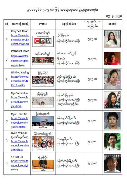 နိုင်ငံတော်၏ အုပ်ချုပ်မှုယန္တရားပျက်ပြားစေရန်ရည်ရွက်ချက်ဖြင့် နိုင်ငံ့ဝန်ထမ်းများအား CDM လှုပ်ရှားမှုတွင် ပါဝင်စေရန်လှုံ့ဆော်ခြင်း၊ CRPH မတရားအသင်းအား ထောက်ခံသည့် အကြောင်းအရာများ၊ မမှန်သတင်းများအား ဖြန့်ဝေခြင်း၊ နိုင်ငံတော်တည်ငြိမ်အေးချမ်းမှုကို ပျက်ပြားစေပြီး ဆူပူအုံကြွမှုဖြစ်ပေါ်စေရန်နှင့် အများပြည်သူ အထိတ် တလန့်ဖြစ်စေရန် အတွက် သွေးထိုးလှုံ့ဆော်မှုများပြုလုပ်ခြင်း၊ Social Pumishment ပြုလုပ်ခြင်းများကို လူမှုကွန်ရက် စာမျက်နှာများတွင် ရည်ရွယ်ချက်ရှိရှိ ဖြင့်ဖော်ပြခြင်းနှင့် ဖြန့်ဝေခြင်းများ ဆောင်ရွက် လျက်ရှိသည့် အောက်ဖော်ပြပါ အနုပညာရှင်အချို့နှင့် အခြားပါဝင်ပတ်သက်သူများအား ရာဇသတ်ကြီးပုဒ်မ ၅၀၅-က ဖြင့် အမှုဖွင့်အရေးယူ ဆောင်ရွက်လျက်ရှိပါသည်။