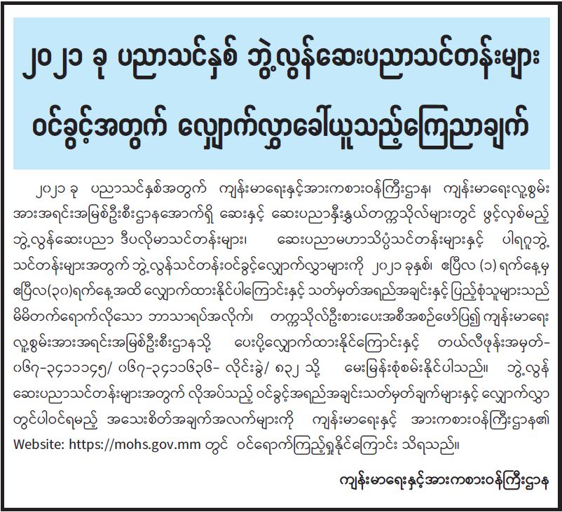 ၂၀၂၁ ခု ပညာသင်နှစ် ဘွဲ့လွန်ဆေးပညာသင်တန်းများ ဝင်ခွင့်အတွက် လျှောက်လွှာခေါ်ယူသည့်ကြေညာချက်