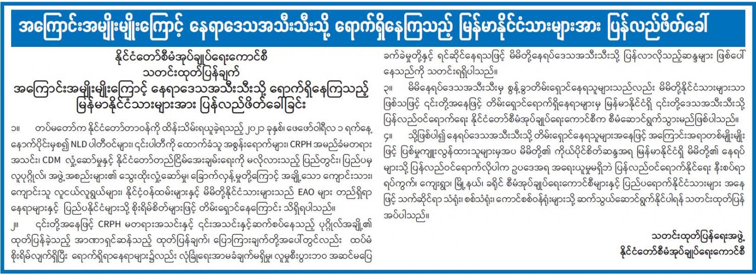 အကြောင်းအမျိုးမျိုးကြောင့် နေရာဒေသအသီးသီးသို့ ရောက်ရှိနေကြသည့် မြန်မာနိုင်ငံသားများအား ပြန်လည်ဖိတ်ခေါ် 04/22/2021