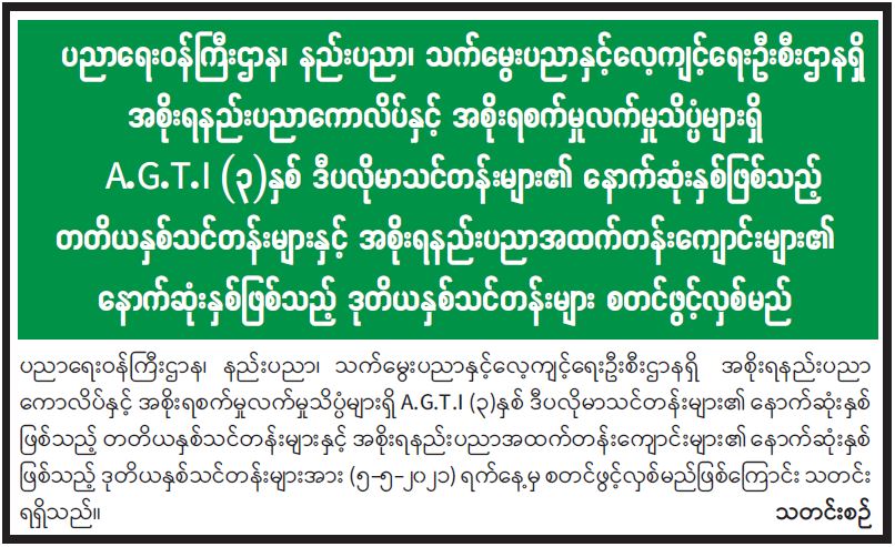ပညာရေးဝန်ကြီးဌာန၊ နည်းပညာ၊ သက်မွေးပညာနှင့်လေ့ကျင့်ရေးဦးစီးဌာနရှိ အစိုးရနည်းပညာကောလိပ်နှင့် အစိုးရစက်မှုလက်မှုသိပ္ပံများရှိ A.G.T.I (၃)နှစ် ဒီပလိုမာသင်တန်းများ၏ နောက်ဆုံးနှစ်ဖြစ်သည့် တတိယနှစ်သင်တန်းများနှင့် အစိုးရနည်းပညာ အထက်တန်းကျောင်းများ၏ နောက်ဆုံးနှစ်ဖြစ်သည့် ဒုတိယနှစ်သင်တန်းများ စတင်ဖွင့်လှစ်မည်