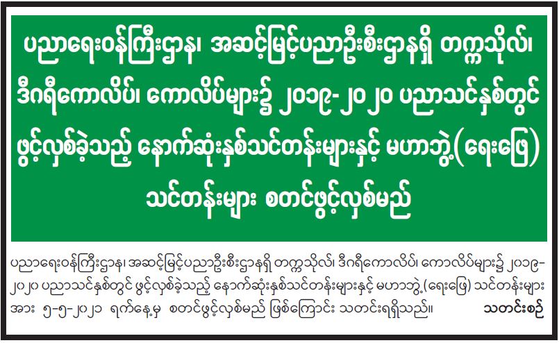 ပညာရေးဝန်ကြီးဌာန၊ အဆင့်မြင့်ပညာဦးစီးဌာနရှိ တက္ကသိုလ်၊ ဒီဂရီကောလိပ်၊ ကောလိပ်များ၌ ၂၀၁၉-၂၀၂၀ ပညာသင်နှစ်တွင် ဖွင့်လှစ်ခဲ့သည့် နောက်ဆုံးနှစ်သင်တန်းများနှင့် မဟာဘွဲ့ (ရေးဖြေ) သင်တန်းများ စတင်ဖွင့်လှစ်မည် 04/22/2021