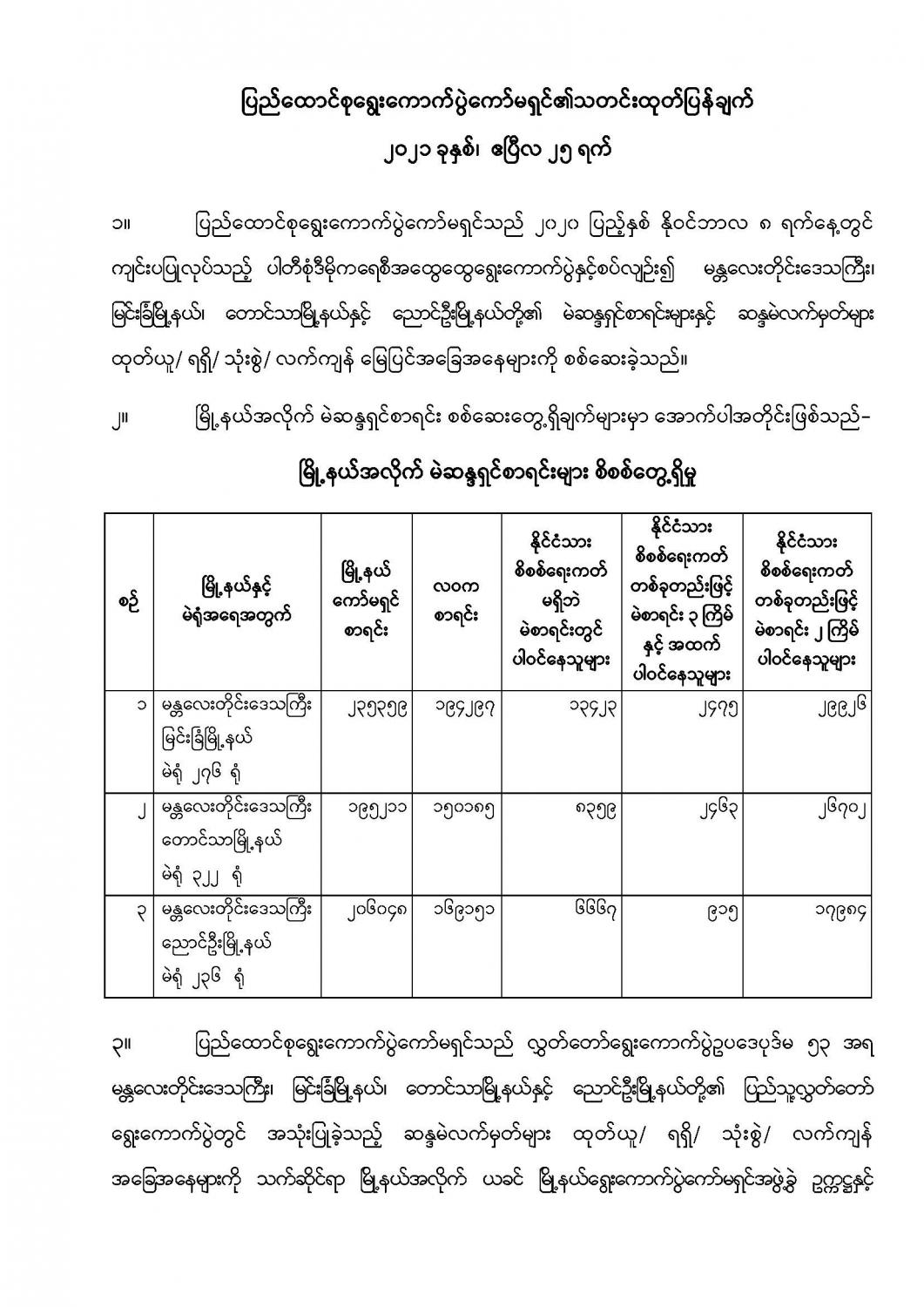 ပြည်ထောင်စုရွေးကောက်ပွဲကော်မရှင်၏သတင်းထုတ်ပြန်ချက် ၂၀၂၁ ခုနှစ်၊ ဧပြီလ ၂၅ ရက် 04/25/2021 ပြည်ထောင်စုရွေးကောက်ပွဲကော်မရှင်၏သတင်းထုတ်ပြန်ချက် ၂၀၂၁ ခုနှစ်၊ ဧပြီလ ၂၅ ရက်