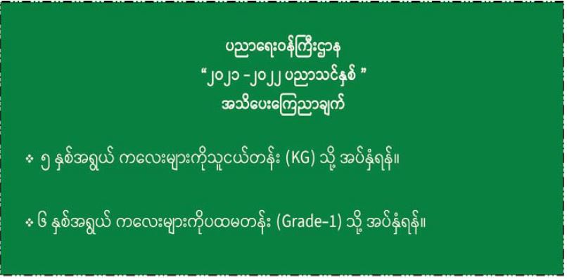ပညာရေးဝန်ကြီးဌာန “၂၀၂၁-၂၀၂၂ ပညာသင်နှစ်” အသိပေးကြေညာချက်