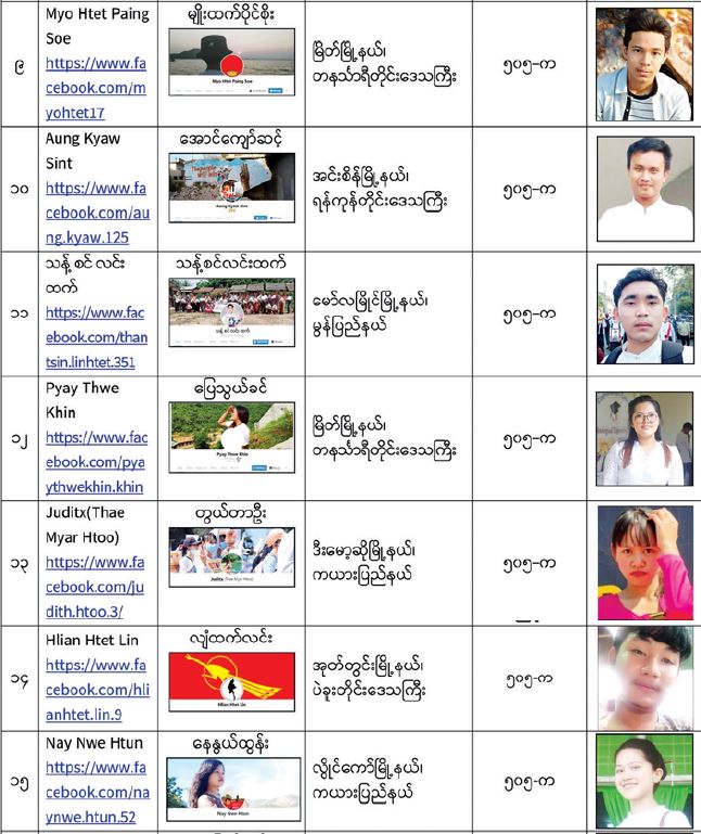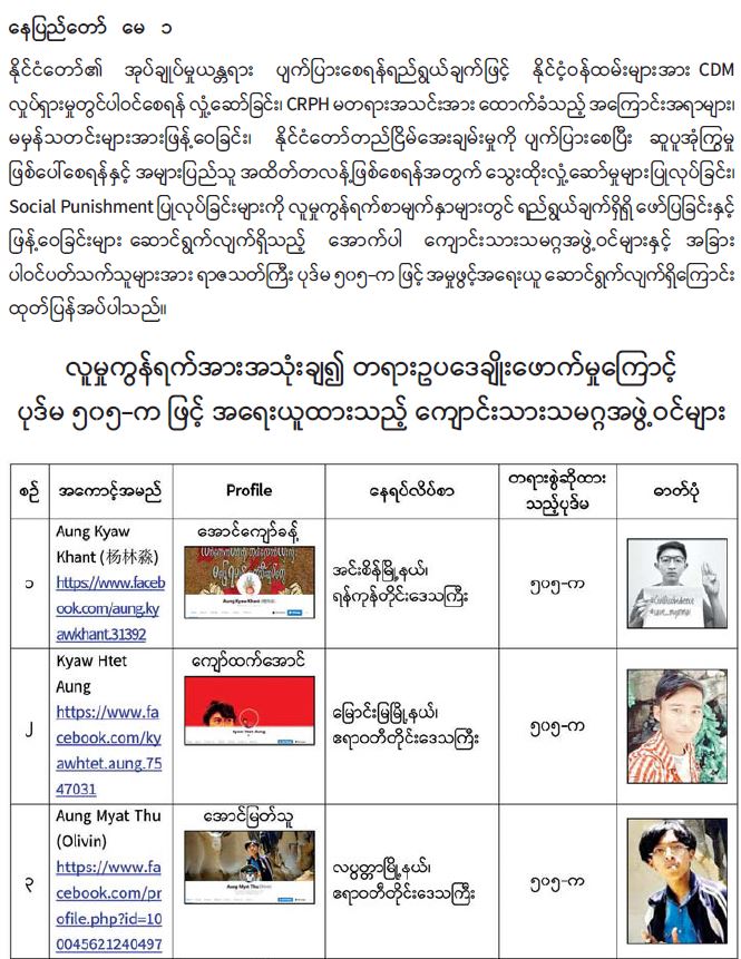 လူမှုကွန်ရက်အားအသုံးပြု၍ နိုင်ငံတော်တည်ငြိမ်အေးချမ်းမှုကို ပျက်ပြားစေရန် ရည်ရွယ်ချက်ဖြင့် လှုံ့ဆော်ခဲ့သည့် တက္ကသိုလ်/ကောလိပ်ကျောင်းများရှိ ကျောင်းသားသမဂ္ဂ အဖွဲ့ဝင်များအား ၅၀၅-က ဖြင့် အမှုဖွင့်အရေးယူဆောင်ရွက်
