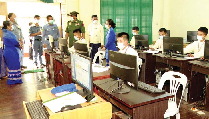 ပြည်ထောင်စုဝန်ကြီးသည် ယနေ့ နံနက်ပိုင်းတွင် ရန်ကုန် တိုင်းဒေသကြီး ဒဂုံ(ဆိပ်ကမ်း) မြို့နယ်ရှိ ပြည်ထောင်စုတိုင်းရင်း သားလူငယ်များ စွမ်းရည်ဖွံ့ဖြိုးရေး ဒီဂရီကောလိပ် (ရန်ကုန်) သို့ ရောက်ရှိပြီး နောက်ဆုံးနှစ်ကျောင်းသား ကျောင်းသူများ စာသင်ခန်းအတွင်း COVID-19 စည်းကမ်းချက်များနှင့်အညီ သင်ကြားနေမှုအား လှည့်လည်ကြည့်ရှုသည်။