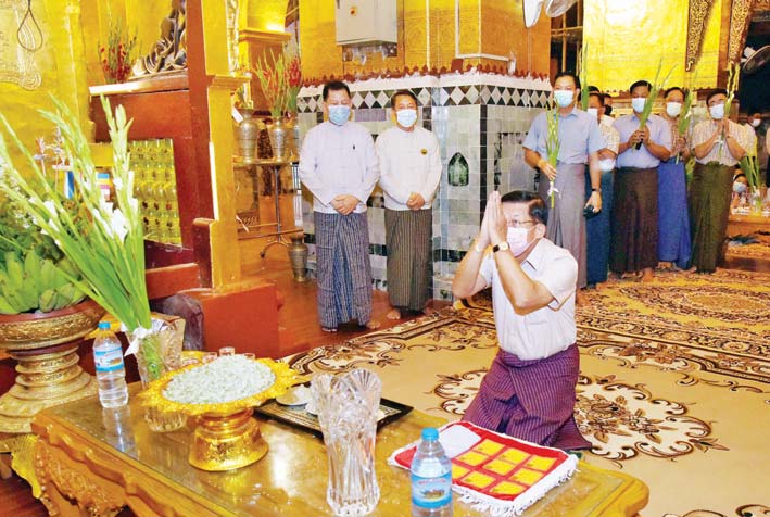 ထို့နောက် နိုင်ငံတော်စီမံအုပ်ချုပ်ရေးကောင်စီဥက္ကဋ္ဌ တပ်မတော် ကာကွယ်ရေး ဦးစီးချုပ်နှင့်ဇနီး၊ အဖွဲ့ဝင်များသည် ဆရာတော်ကြီးထံမှ ငါးပါးသီလခံယူ ဆောက်တည်၍ အနုမောဒနာတရား နာယူကြပြီး ရေစက်သွန်းချ အမျှပေးဝေကြ သည်။ ယင်းနောက် နိုင်ငံတော်စီမံအုပ်ချုပ်ရေးကောင်စီဥက္ကဋ္ဌ တပ်မတော် ကာကွယ်ရေး ဦးစီးချုပ်နှင့်ဇနီးနှင့် အဖွဲ့ဝင်များက ဆရာတော်ကြီးထံ လှူဖွယ်ပစ္စည်းများ ဆက်ကပ်လှူဒါန်းရာ ဓမ္မလက်ဆောင်များ ပြန်လည်ပေးအပ်ခဲ့ကြောင်း သတင်းရရှိသည်။
