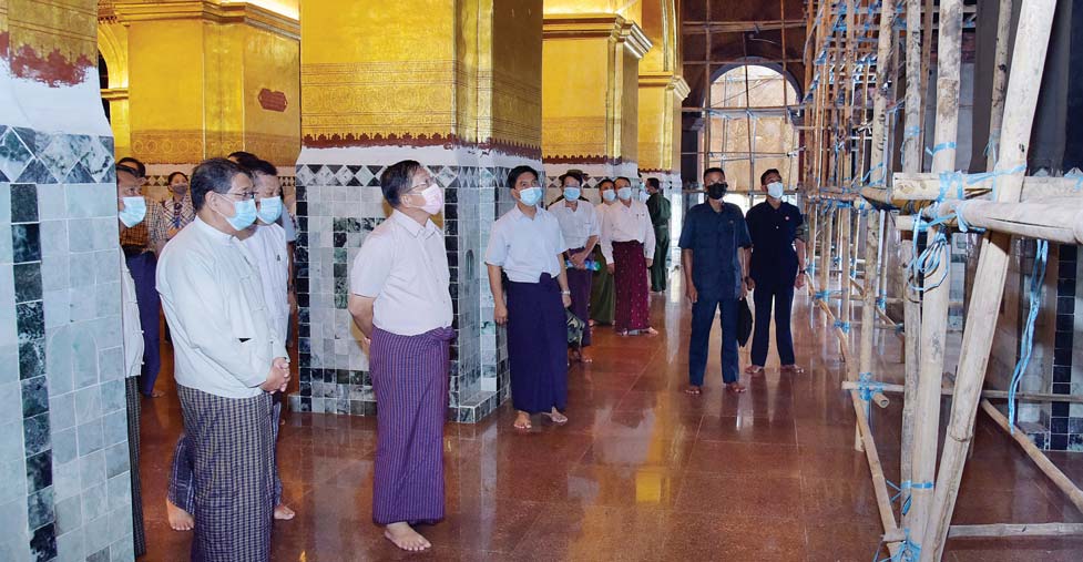 ထို့နောက် နိုင်ငံတော်စီမံအုပ်ချုပ်ရေးကောင်စီဥက္ကဋ္ဌ တပ်မတော်ကာကွယ် ရေးဦးစီးချုပ်နှင့် အဖွဲ့ဝင်များသည် ဘုရားကြီးအတွင်း တိုင်လုံးတော်များနှင့် မျက်နှာကျက်များ မွမ်းမံထားရှိမှု အခြေအနေများ၊ ကြေးရုပ်ပြတိုက်နှင့် သမိုင်းပန်းချီပြခန်း တို့အတွင်းလိုက်လံကြည့်ရှု၍ရှေးဟောင်းသမိုင်းဝင်လက်ရာများအား စနစ်တကျထိန်းသိမ်းထားရှိရေး၊ ပေရွက်များဖြင့် ရေးသားထားရှိသည့် ပိဋကတ်သုံးပုံ အပါအဝင် အခြားဗုဒ္ဓဝင်မှတ်တမ်းများသည် အလွန်တန်ဖိုးရှိ သည့် သမိုင်းလက်ရာများဖြစ်သဖြင့် မပျောက်ပျက်အောင် ထိန်းသိမ်းရမည်ဖြစ်ပြီး မိတ္တူ ပြန်လည်ကူးယူ၍ အကြောင်းအရာအလိုက် Program ရေးဆွဲကာ စနစ်တကျသိမ်းဆည်း ထိန်းသိမ်းနိုင်စေရေး၊ အများပြည်သူ ဖတ်ရှုလေ့လာနိုင်စေရန် ခင်းကျင်းပြသထားသည့် သမိုင်း မှတ်တမ်းမှတ်ရာများကို ရေးသား ဖော်ပြရာတွင် မြန်မာစာရေးထုံးသတ်ပုံများ မှန်ကန်မှုရှိစေရေး ဂရုပြုရန်လိုအပ်သည့် အခြေအနေများနှင့် ပတ်သက်၍ ဂေါပကအဖွဲ့နှင့် တာဝန်ရှိသူများအား မှာကြားခဲ့သည်။