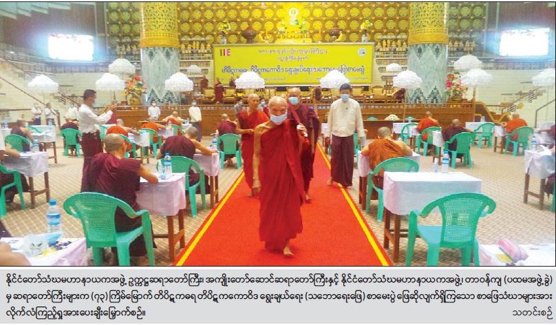 နိုင်ငံတော်သံဃမဟာနာယကအဖွဲ့ ဥက္ကဌဆရာတော်ကြီး၊ အကျိုးတော်ဆောင် ဆရာတော်ကြီးနှင့် နိုင်ငံတော်သံဃမဟာနာယကအဖွဲ့၊ တာဝန်ကျ(ပထမအဖွဲ့ခွဲ)မှ ဆရာတော်ကြီးများက (၇၃)ကြိမ်မြောက် တိပိဋကဓရ တိပိဋကကောဝိဒ ရွေးချယ်ရေး (သဘောရေးဖြေ)စာမေးပွဲ ဖြေဆိုလျက်ရှိကြသော စာဖြေသံဃာများအား လိုက်လံကြည့်ရှု အားပေးချီးမြှောက်