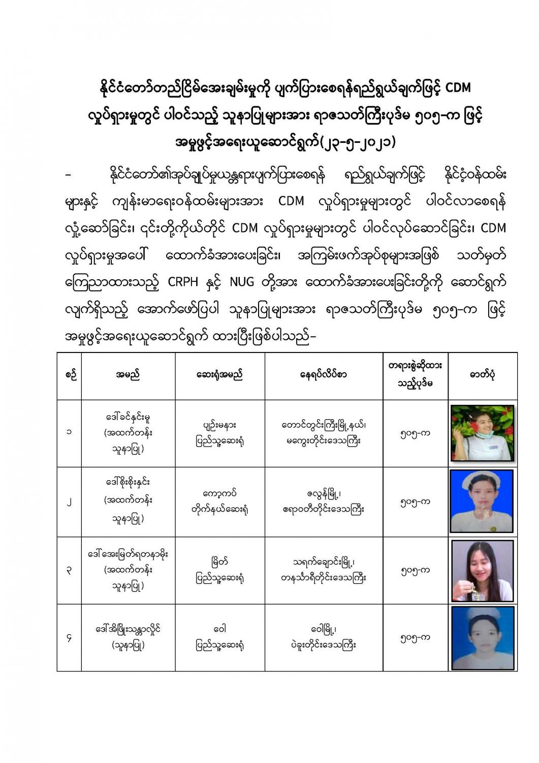 နိုင်ငံတော်တည်ငြိမ်အေးချမ်းမှုကို ပျက်ပြားစေရန်ရည်ရွယ်ချက်ဖြင့် CDM လှုပ်ရှားမှုတွင် ပါဝင်သည့် သူနာပြုများအား ရာဇသတ်ကြီးပုဒ်မ ၅၀၅-က ဖြင့် အမှုဖွင့်အရေးယူဆောင်ရွက်(၂၃-၅-၂၀၂၁) 05/23/2021