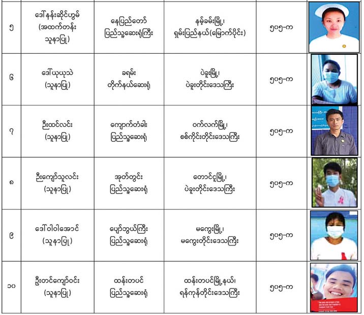 နိုင်ငံတော်၏အုပ်ချုပ်မှုယန္တရားပျက်ပြားစေရန် ရည်ရွယ်ချက်ဖြင့် နိုင်ငံ့ဝန်ထမ်း များနှင့် ကျန်းမာရေး ဝန်ထမ်းများအား CDM လှုပ်ရှားမှုများတွင် ပါဝင်လာစေရန် လှုံ့ဆော်ခြင်း၊ ၎င်းတို့ကိုယ်တိုင် CDM လှုပ်ရှား မှုများတွင် ပါဝင်လုပ်ဆောင်ခြင်း၊ CDM လှုပ်ရှားမှုအပေါ် ထောက်ခံအားပေးခြင်း၊ အကြမ်းဖက်အုပ်စုများအဖြစ် သတ်မှတ် ကြေညာ ထားသည့် CRPH နှင့် NUG တို့အား ထောက်ခံအားပေးခြင်းတို့ကို ဆောင်ရွက် လျက်ရှိသည့် အောက်ဖော် ပြပါ သူနာပြုများအား ရာဇသတ်ကြီးပုဒ်မ ၅၀၅-က ဖြင့် အမှုဖွင့်အရေးယူဆောင်ရွက် ထားပြီးဖြစ် ပါသည်-