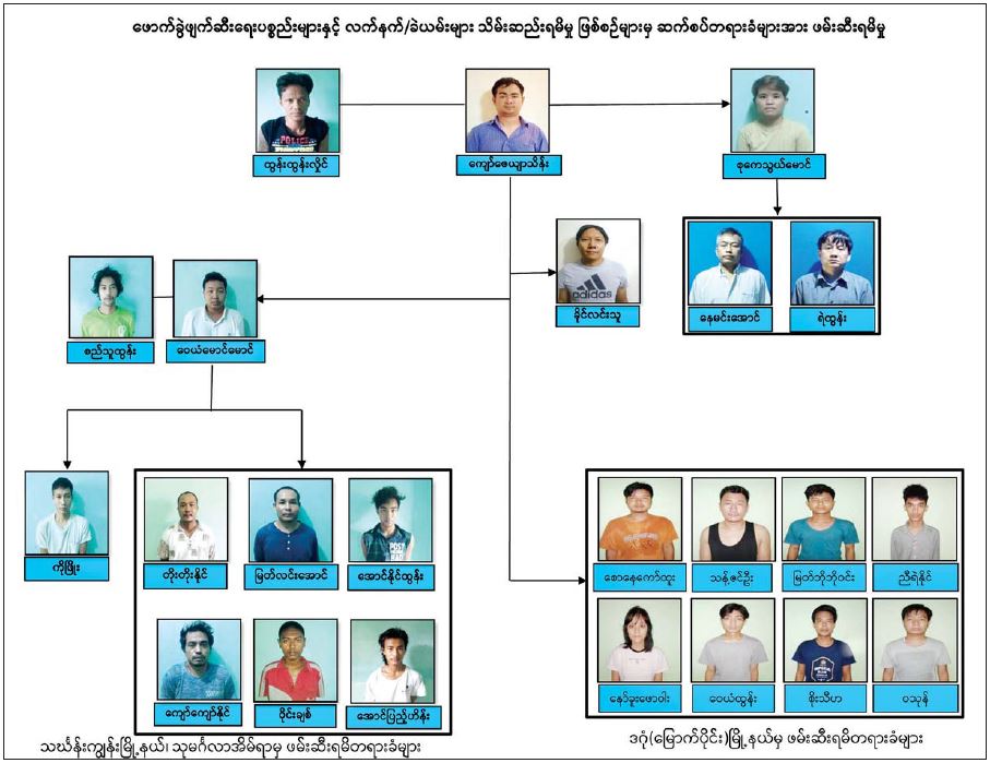 ထိုသို့ဖော်ထုတ်ထိန်းသိမ်းမှုများ ဆောင်ရွက်လျက်ရှိရာ မေလ ၂၁ ရက် ညနေပိုင်းတွင် သတင်းအရ ကျော်ဇေယျာသိန်း(၃၈)နှစ် အား ရန်ကုန်တိုင်း ဒေသကြီး၊ ကမာရွတ်မြို့နယ်၊ နာနတ်တောလမ်းရှိ Grand Hanthar ဆေးရုံ၌ ဖမ်းဆီးရမိခဲ့ပြီး ၎င်း၏ထွက်ဆိုချက်အရ ထွန်းထွန်းလှိုင်(၄၄)နှစ်၊ ခိုင်လင်းသူ (ခ)ကိုခိုင်(၃၈)နှစ်၊ ဝေယံမောင်မောင်(၂၅)နှစ်နှင့် စည်သူထွန်း(၂၀)နှစ်တို့အား ထပ်မံဖမ်းဆီး ရမိခဲ့သည်။
