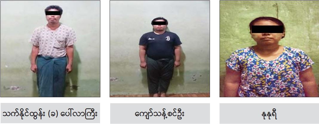 ထိုသို့ လုပ်ဆောင်လျက်ရှိရာ ဧရာဝတီတိုင်းဒေသကြီး၊ မအူပင်မြို့နယ်၊ မီးသွေးချောင်း ကျေးရွာနေ သက်နိုင်ထွန်း(ခ)ပေါ်လာကြီး(ဘ)ဦးကံထွန်း၊ မရမ်းရိုးကျေးရွာနေ ကျော်သန့်စင်ဦး (ခ)ကျော်ကြီး(ဘ)ဦးအောင်အောင်ဦးနှင့် ငါးသိုင်းချောင်းမြို့၊ မြစ်ဆယ်အုပ်စု၊ ရွာသစ်ကုန်း ကျေးရွာနေ ငါးသိုင်းချောင်းတိုက်နယ်ဆေးရုံမှ အထက်တန်း သူနာပြု မနုနုရီ(ဘ) ဦးဌေးအောင် တို့ ၃ ဦးသည် ၎င်းတို့၏ Thet Naing Tun Facebook account ၊ Kyaw Thant Sim Oo Facebook accountနှင့် Htoo Htet Myat Mg Facebook account များဖြင့် လူမှုကွန်ယက်ပေါ်တွင် မဟုတ်မမှန် သတင်းများ ရေးသားဖြန့်ဝေခြင်း၊ တရားမဝင် သတင်းမီဒီယာများမှ သတင်းများအား ပြန်လည်မျှဝေခြင်း၊ တရားမဝင် အဖွဲ့အစည်းဖြစ်သည့် CRPH အားထောက်ခံခြင်း၊ အများပြည်သူနှင့် အစိုးရဝန်ထမ်းများအား အထိတ်တလန့် ဖြစ်စေရန်နှင့် ပြစ်မှုကျူးလွန်လာစေရန် သွေးထိုးလှုံ့ဆော် ရေးသားခဲ့ခြင်းများ ဆောင်ရွက် လျက်ရှိသဖြင့် ၎င်းတို့၏ နေအိမ်များအသီးသီး၌ မေ ၃၀ ရက်တွင် အသီးသီးဖမ်းဆီး ထိန်းသိမ်းခဲ့ပြီး သက်ဆိုင်ရာရဲစခန်းများ၌ ရာဇသတ်ကြီးပုဒ်မ၊ ၅၀၅-က ဖြင့် အမှုဖွင့်အရေးယူ ဆောင်ရွက်လျက်ရှိကြောင်း သတင်းရရှိသည်။