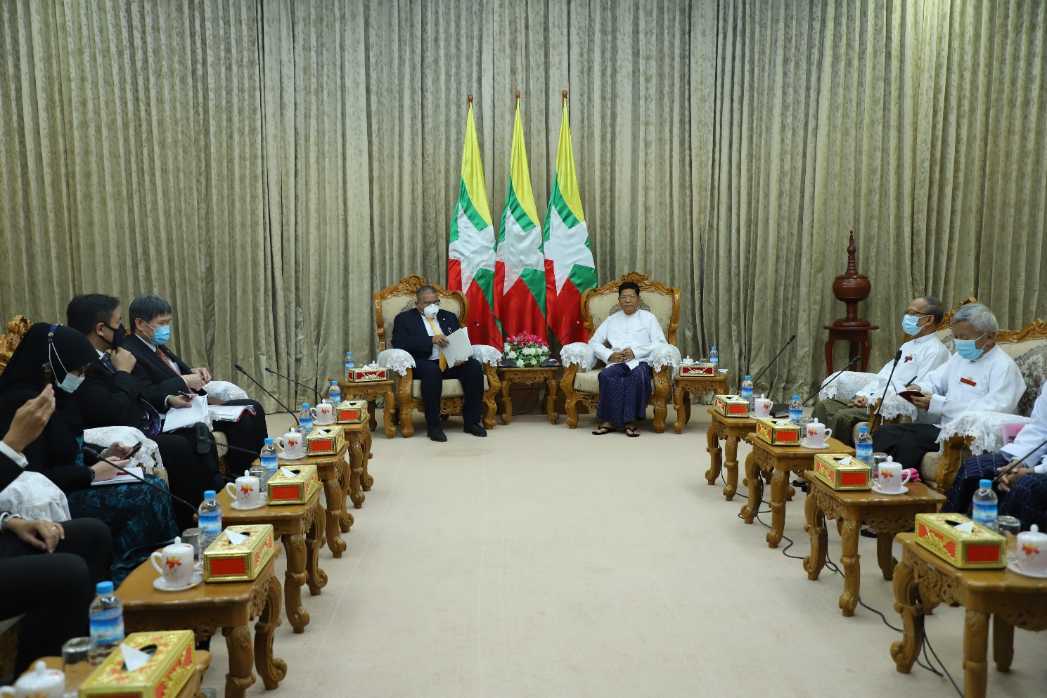 ပြည်ထောင်စုရွေးကောက်ပွဲကော်မရှင်ဥက္ကဋ္ဌ ဦးသိန်းစိုးသည် အာဆီယံဥက္ကဋ္ဌ ဘရူနိုင်း နိုင်ငံခြားရေးဝန်ကြီး H.E. Dato Erywan Pehin Yusof နှင့် အာဆီယံအတွင်းရေးမှူးချုပ်ဖြစ်သူ H.E. Dato Lim Jock Hoi တို့ကို ယနေ့ ညနေ ၃ နာရီခွဲတွင် နေပြည်တော်ရှိ ပြည်ထောင်စု ရွေးကောက်ပွဲကော်မရှင်ရုံး၊ ဧည့်တွေ့ခန်းမဆောင်၌ လက်ခံတွေ့ ဆုံသည်။