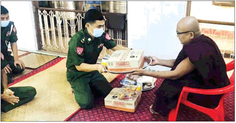 ထိုသို့ ဆောင်ရွက်လျက်ရှိရာ ယနေ့တွင် ရန်ကုန် တိုင်းဒေသကြီး လှိုင်မြို့နယ် အမှတ်(၁၃)ရပ်ကွက်ရှိ ဇေယျာမင်္ဂလာကျောင်းတိုက်မှ သံဃာတော်များအား ဆွမ်း ဆန်တော်၊ ဆီ၊ ဆား၊ ပဲ အမယ်လေးမျိုး၊ Covid-19 ရောဂါ ကာကွယ်ရေး အထောက်အကူပြု ပစ္စည်းများနှင့် လှူဖွယ်ပစ္စည်းများကို ရန်ကုန် တိုင်းစစ်ဌာနချုပ်၊ ရန်ကုန်တပ်နယ်မှ တာဝန်ရှိသူများက သွားရောက်၍ ဆက်ကပ်လှူဒါန်းခဲ့ကြကြောင်း သတင်းရရှိသည်။