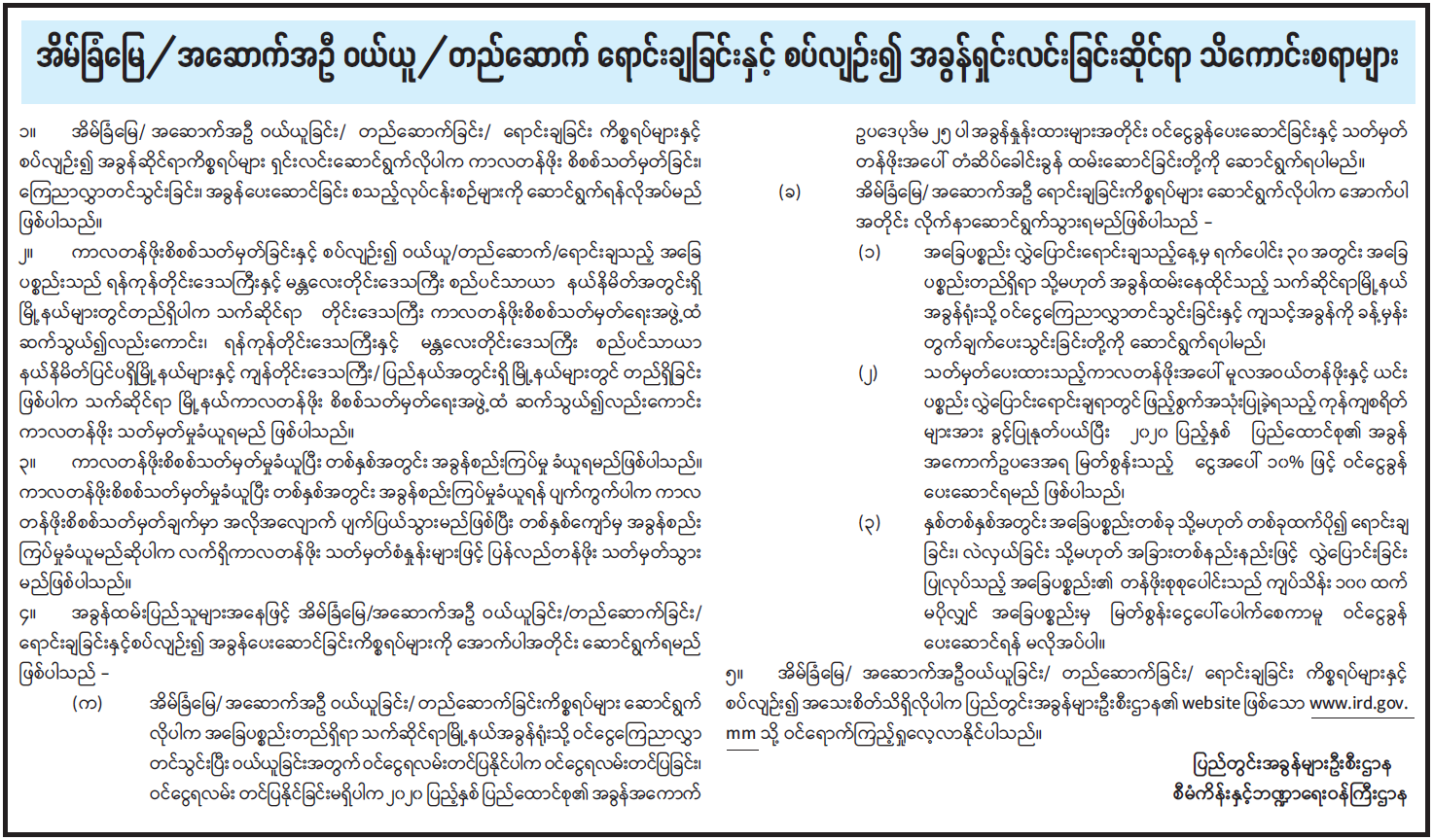 အိမ်ခြံမြေ/ အဆောက်အဦ ဝယ်ယူ/တည်ဆောက် ရောင်းချခြင်းနှင့် စပ်လျဉ်း၍ အခွန်ရှင်းလင်းခြင်းဆိုင်ရာ သိကောင်းစရာများ 06/16/2021