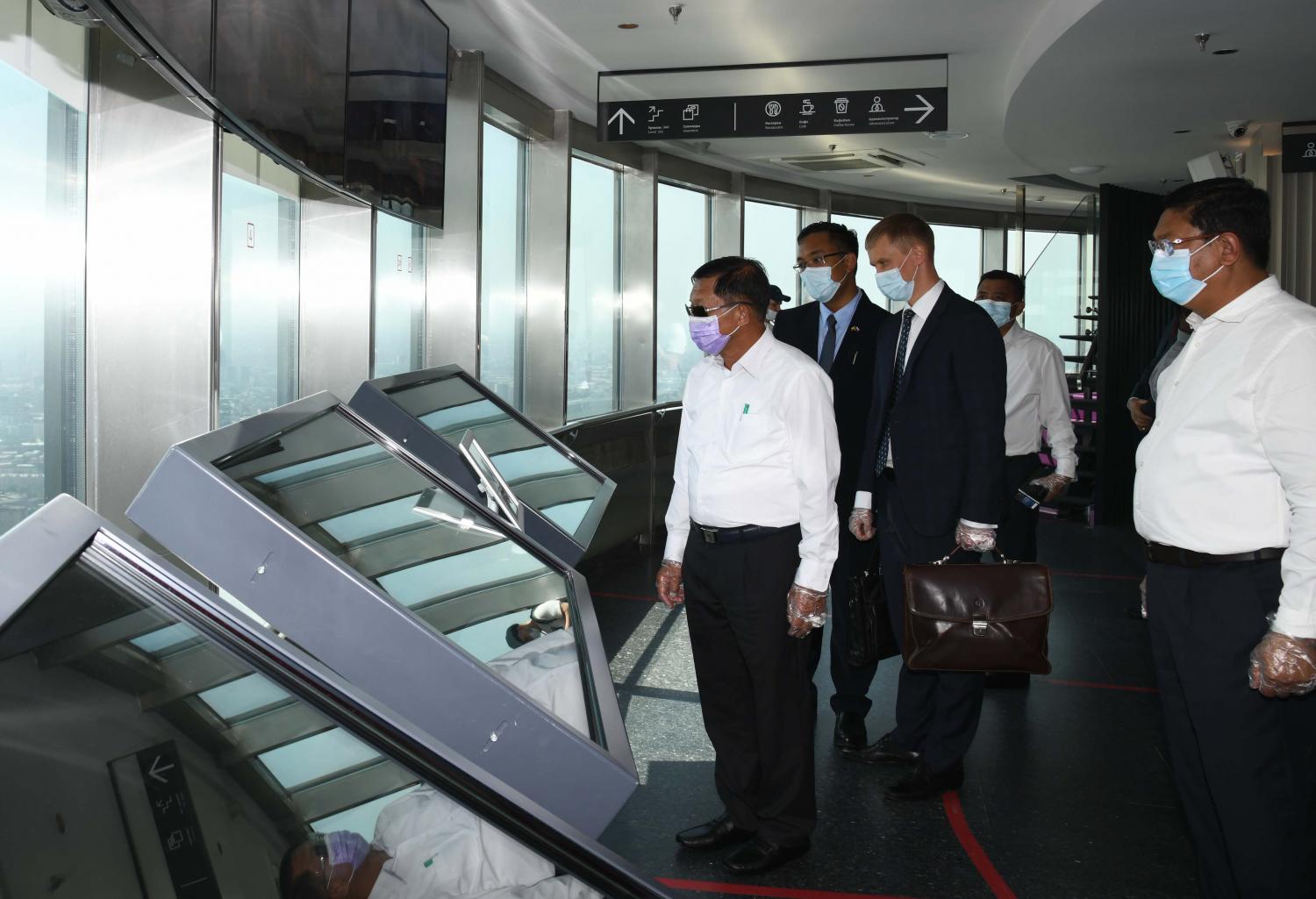 ထို့နောက် နိုင်ငံတော်စီမံအုပ်ချုပ်ရေးကောင်စီ ဥက္ကဋ္ဌ၊ တပ်မတော်ကာကွယ်ရေး ဦးစီးချုပ်နှင့် အဖွဲ့ဝင်များသည် ရုရှားဖက်ဒရေးရှင်းနိုင်ငံ၊ မော်စကိုမြို့ရှိ OSTANKINO Tower သို့ သွားရောက်လေ့လာကြည့်ရှုကြရာ မြန်မာစစ်သံ(ကြည်း၊ ရေ၊ လေ) ဗိုလ်မှူးချုပ် ကျော်စိုးမိုး နှင့် ရုရှားဖက်ဒရေးရှင်းနိုင်ငံ၊ ကာကွယ်ရေးဝန်ကြီးဌာနမှ တာဝန်ရှိသူများက လိုက်လံရှင်းလင်းပြသကြသည်။ ရှင်းလင်းမှုများအပေါ် နိုင်ငံတော် စီမံအုပ်ချုပ်ရေးကောင်စီ ဥက္ကဋ္ဌ၊ တပ်မတော်ကာကွယ်ရေးဦးစီးချုပ်က သိရှိလိုသည်များအား ပြန်လည်မေးမြန်းခဲ့ပြီး မော်စကိုမြို့အား အပေါ်စီးမှ မြင်တွေ့ရသည့် ရှုခင်းများကို ကြည့်ရှုကြကာ အမှတ်တရဓာတ်ပုံများ ရိုက်ကူးကြသည်။