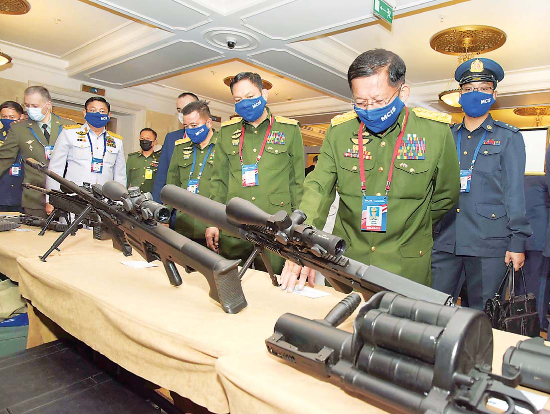 ဦးစွာ နိုင်ငံတော်စီမံအုပ်ချုပ်ရေးကောင်စီ ဥက္ကဋ္ဌ၊ တပ်မတော်ကာကွယ်ရေး ဦးစီးချုပ်နှင့် ညီလာခံသို့ တက်ရောက်လာကြသူများက Rosoboronexport ကုမ္ပဏီ နှင့် အခြားကုမ္ပဏီများက ခင်းကျင်း ပြသထားသည့် ကာကွယ်ရေးဆိုင်ရာ စစ်လက်နက် ပစ္စည်း များအား လေ့လာကြည့်ရှုကြသည်။